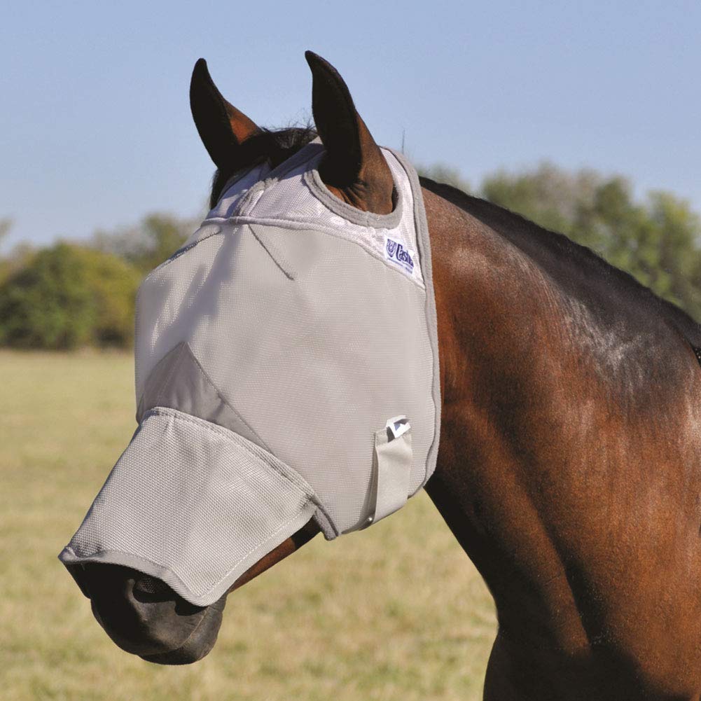 Cashel(R) Crusader Long Nose Fly Mask Offer your horse the ultimate in fly protection and a safe alternative to toxic and ineffective fly sprays. Top-rated for comfort, design, and fit by equine clinicians and publications, the Cashel(R) Crusader Fly Mask employs a three-hole cap design that ensures comfort, eliminates forelock damage and remains stationary whether your horse is in the stall or the pasture. The panels are constructed of soft-coated nylon micromesh that hovers above the skins surface, protecting the soft tissues of the eyes and forehead from flying insects and blocking 70% of the suns damaging UV rays. Edges and seams are bound with low-nap plush fabric that wont attach to irritating burrs or bristles. Features: Soft and flexible for maximum comfort Durable and long-lasting Keeps mesh away from the eye area Offers 70% UV sun protection Item Specifications: Closure: hook and loop tape Color: Grey Material: Nylon Mesh