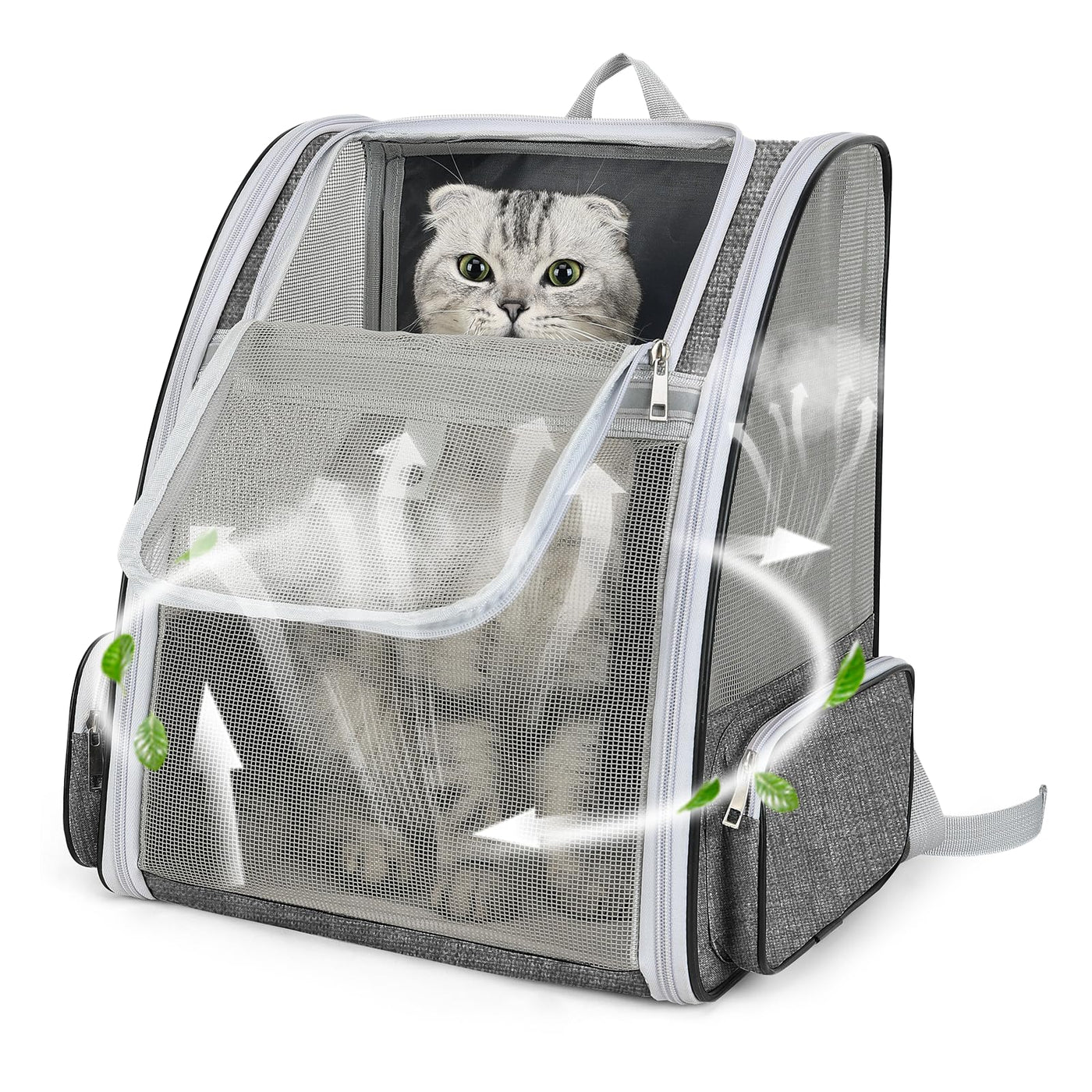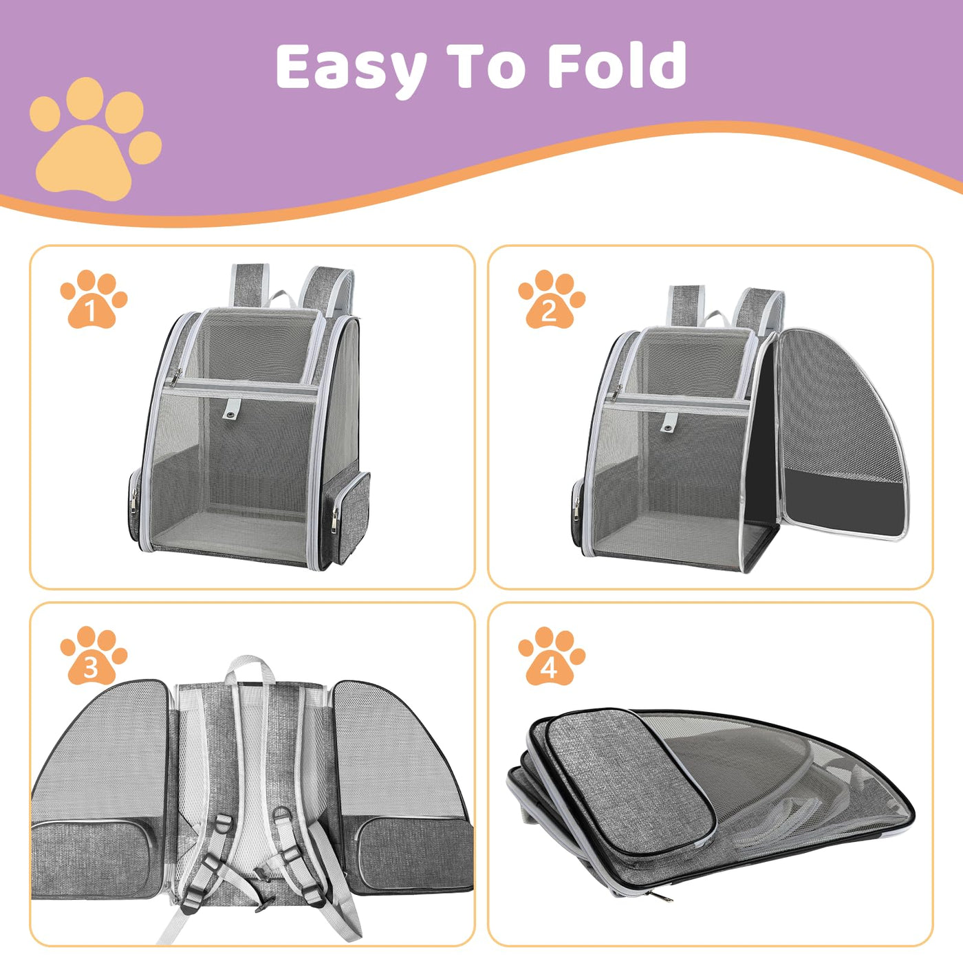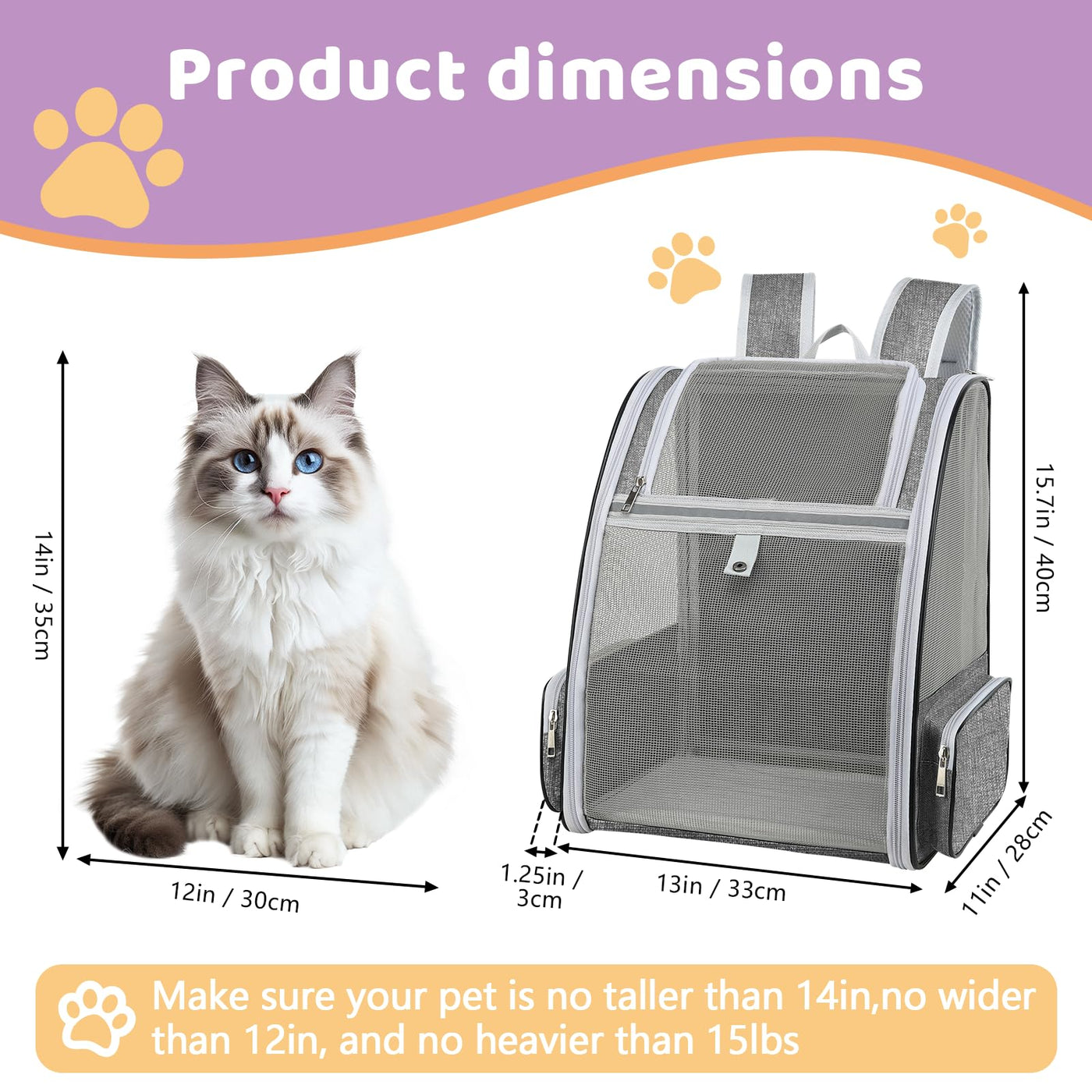 Spacious & Airline Approved - Measuring 12.6''L X 11''W X 15.7''H, This Large Pet Backpack Comfortably Fits Cats, Small Dogs, And Other Small To Medium-Sized Pets Up To 15 Lbs. Designed To Comply With Most Airline Under-Seat Requirements For Travel Convenience. (Please Confirm With Your Airline Before Flying.) Breathable & Visible Design - Built With A Three-Sided Tear-Resistant Pvc Mesh, This Carrier Ensures Excellent Airflow And Visibility, Allowing Your Pet To Stay Calm And Comfortable. It Also Includes A Fun Feather Toy To Keep Your Pet Engaged During Your Journey. Comfort & Safety First - The Cozy, Removable Mat Offers A Soft And Hygienic Resting Area. A Transparent Front Window Lets Curious Pets Peek Out, While A Built-In Latch Hook Keeps Them Secure. Multiple Entrances-Including Two Side Doors And A Top Window-Make It Easy To Access Or Interact With Your Pet. Foldable & Ergonomic For Easy Carrying - Designed With Convenience In Mind, This Pet Backpack Folds Flat For Space-Saving Storage. The Back Bulge Ventilation System, Padded Adjustable Shoulder Straps, And Chest Buckle Provide Superior Weight Distribution And Reduce Pressure On Your Shoulders And Back. Perfect For Travel & Outdoor Adventures - Crafted From Scratch-Resistant, Bite-Proof Materials, This Backpack Is Built To Last. Side Pockets Offer Storage For Treats, Water, Or Personal Items, Making It The Ideal Companion For Hiking, Walking, And Everyday Outings With Your Furry Friend.