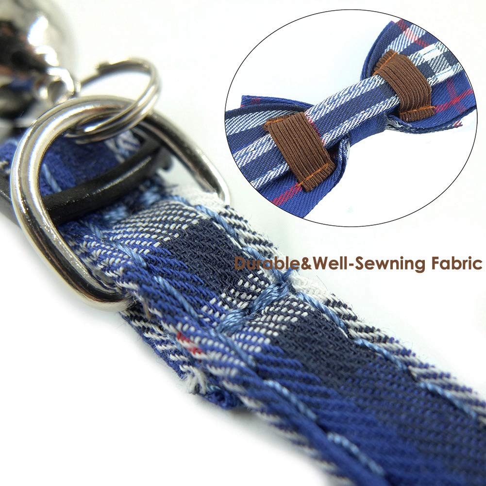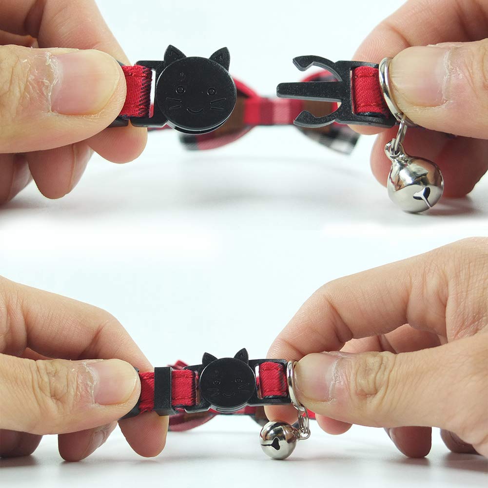 Take your cat outdoors with a adorable and attractive collar. With style and strength, the high quality soft cotton ensures long lasting comfort. Featuring a bowtie, a safety quick release cat clip and protect bell. Quantity: 1pcs/pack or 2pcs/pack Key Benefits: Adjustable These safety cat collars are adjustable from 6.8 to 10.8; width is 0.4. Its easy for you to find a custom fit for your kittens. Stylish Our collars have many styles, plaid, dots, camouflage, black/red/orange/blue/green/pink colorful, very popular. Bow Tie The bowtie is removable, use 5 elastic bands attached collar, bowtie is handmade and durable. Allow ID tags There is a stainless steel D-ring on each collar that allows you to attach an ID tag. Wildlife Safety Bell Collar has a wildlife safety bell to warn birds and small animals that the cat is coming. On the other hand, you will never lost your kitty. The bell can be taken off or replaced. Safety Quick-release safety cat clip comes undone with slight tension to prevent snagging on branches, fences, and other hazards. Heavy-duty Quality cotton belt ensures long lasting comfort and durability. Our products are for cats and small puppies, please make sure check your pets neck girth is fit the size before purchasing the items.