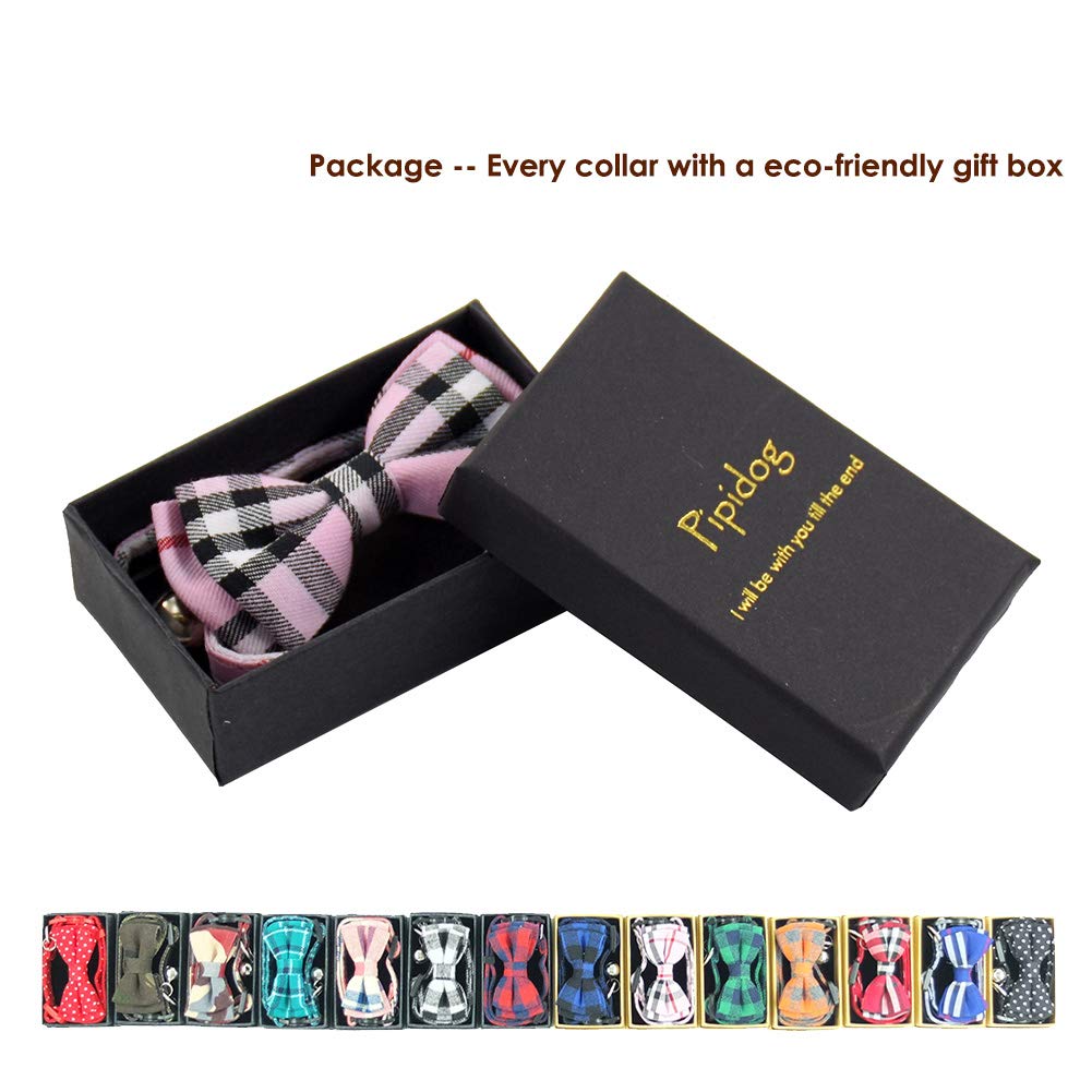 Take your cat outdoors with a adorable and attractive collar. With style and strength, the high quality soft cotton ensures long lasting comfort.Featuring a bowtie, a safety quick release cat clip and protect bell. Quantity: 1pcs/pack or 2pcs/pack Key Benefits: Adjustable These safety cat collars are adjustable from 6.8 to 10.8; width is 0.4. Its easy for you to find a custom fit for your kittens. Stylish Our collars have many styles, plaid, dots, camouflage, black/red/orange/blue/green/pink colorful, very popular. Bow Tie The bowtie is removable, use 2 elastic bands attached collar, bowtie is handmade and durable. Allow ID tags There is a stainless steel D-ring on each collar that allows you to attach an ID tag. Wildlife Safety Bell Collar has a wildlife safety bell to warn birds and small animals that the cat is coming. On the other hand, you will never lost your kitty. The bell can be taken off or replaced. Safety Quick-release Safety cat clip comes undone with slight tension to prevent snagging on branches, fences, and other hazards. Heavy-duty Quality Cotton belt ensures long lasting comfort and durability. Our products are for cats and small puppies, please make sure check your pets neck girth is fit the size before purchasing the items.