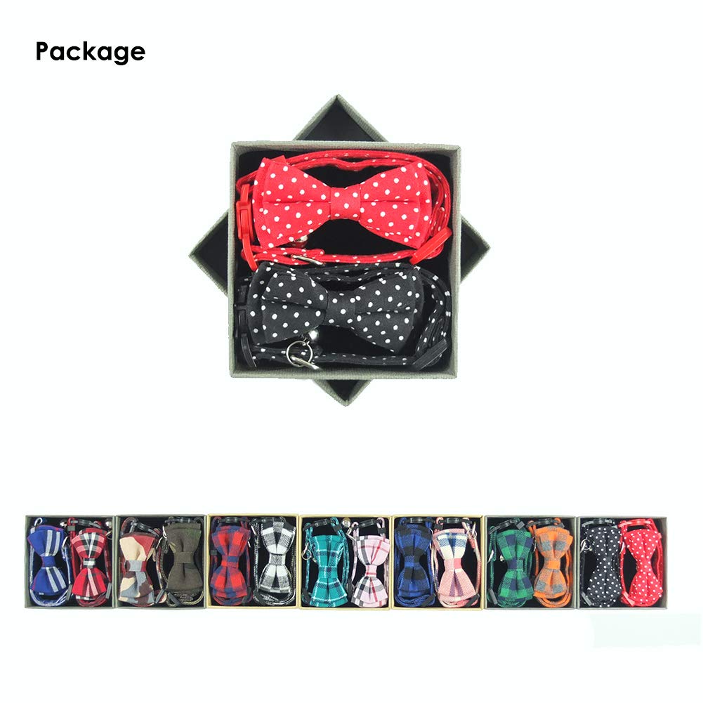 Take your cat outdoors with a adorable and attractive collar. With style and strength, the high quality soft cotton ensures long lasting comfort.Featuring a bowtie, a safety quick release cat clip and protect bell. Quantity: 1pcs/pack or 2pcs/pack Key Benefits: Adjustable These safety cat collars are adjustable from 6.8 to 10.8; width is 0.4. Its easy for you to find a custom fit for your kittens. Stylish Our collars have many styles, plaid, dots, camouflage, black/red/orange/blue/green/pink colorful, very popular. Bow Tie The bowtie is removable, use 2 elastic bands attached collar, bowtie is handmade and durable. Allow ID tags There is a stainless steel D-ring on each collar that allows you to attach an ID tag. Wildlife Safety Bell Collar has a wildlife safety bell to warn birds and small animals that the cat is coming. On the other hand, you will never lost your kitty. The bell can be taken off or replaced. Safety Quick-release Safety cat clip comes undone with slight tension to prevent snagging on branches, fences, and other hazards. Heavy-duty Quality Cotton belt ensures long lasting comfort and durability. Our products are for cats and small puppies, please make sure check your pets neck girth is fit the size before purchasing the items.