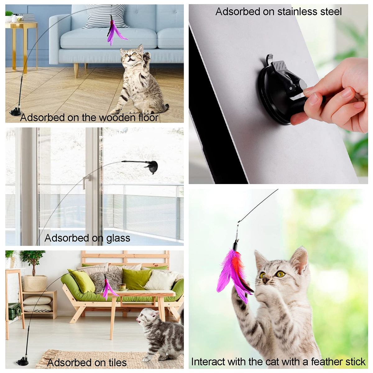 Cat Feather Toys Interactive Cats - Dorakitten Cat Powerful Suction Cup Handheld Teaser Wand Toy And 5Pcs Replacement Feather Wi