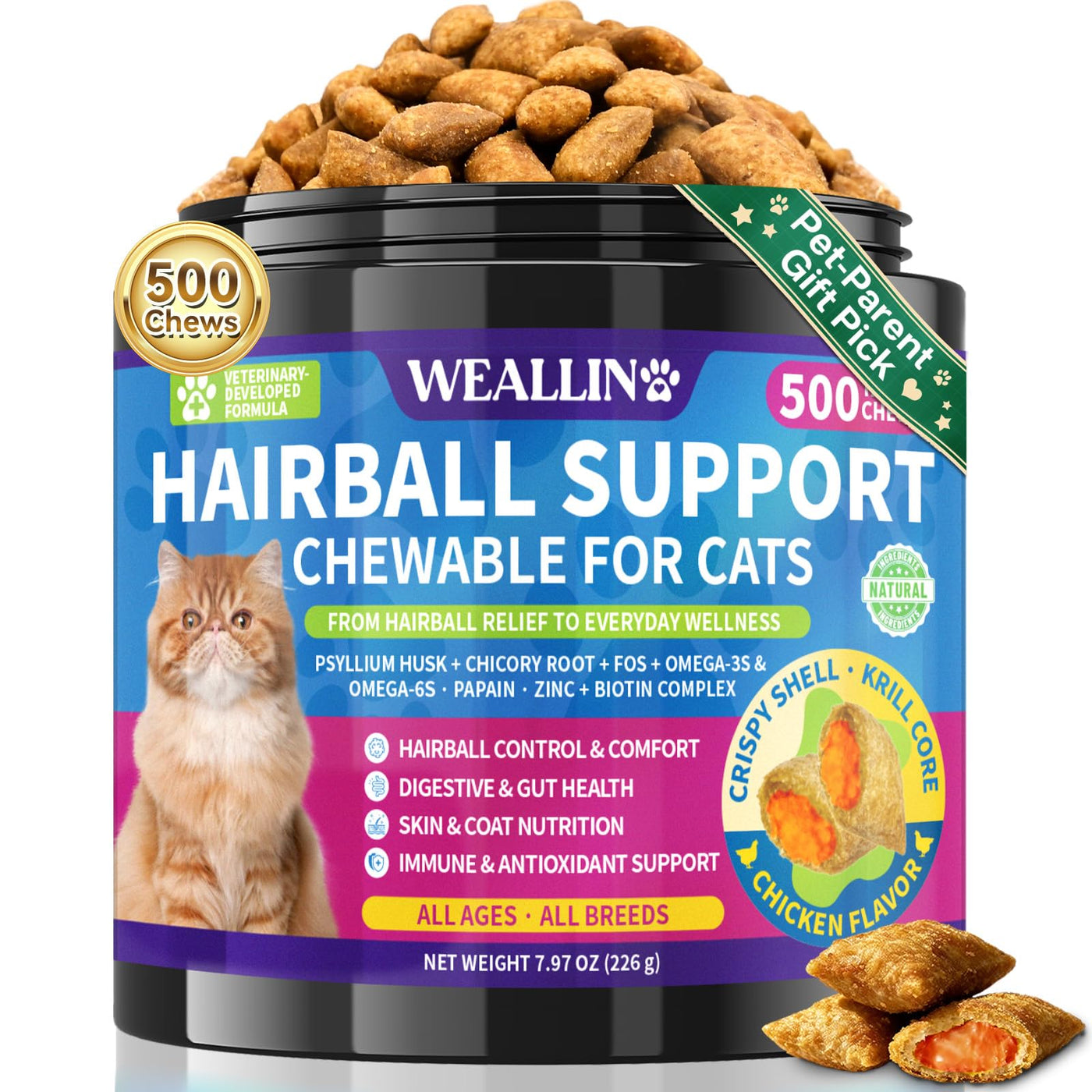 Cat Hairball Support Chews 500 Chews, Cat Hairball Remedy Treats Crunchy Shell With Krill Core, Furball Control Relief, Digestio