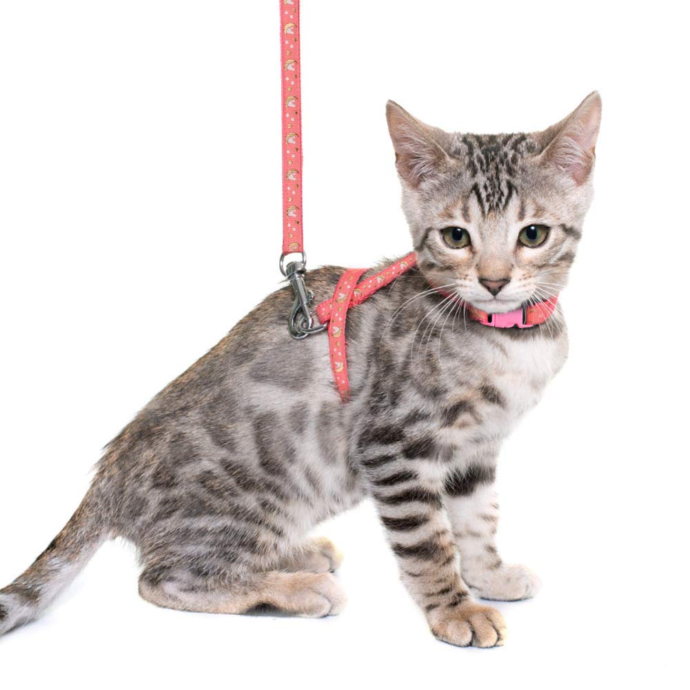 Q: What sizes does the Cat Harness and Leash Set accommodate?A: The Cat Harness and Leash Set is adjustable and fits a neck girth of 7.7" to 12.1" and a chest girth of 10.8" to 18.1", making it suitable for most kittens and small cats.