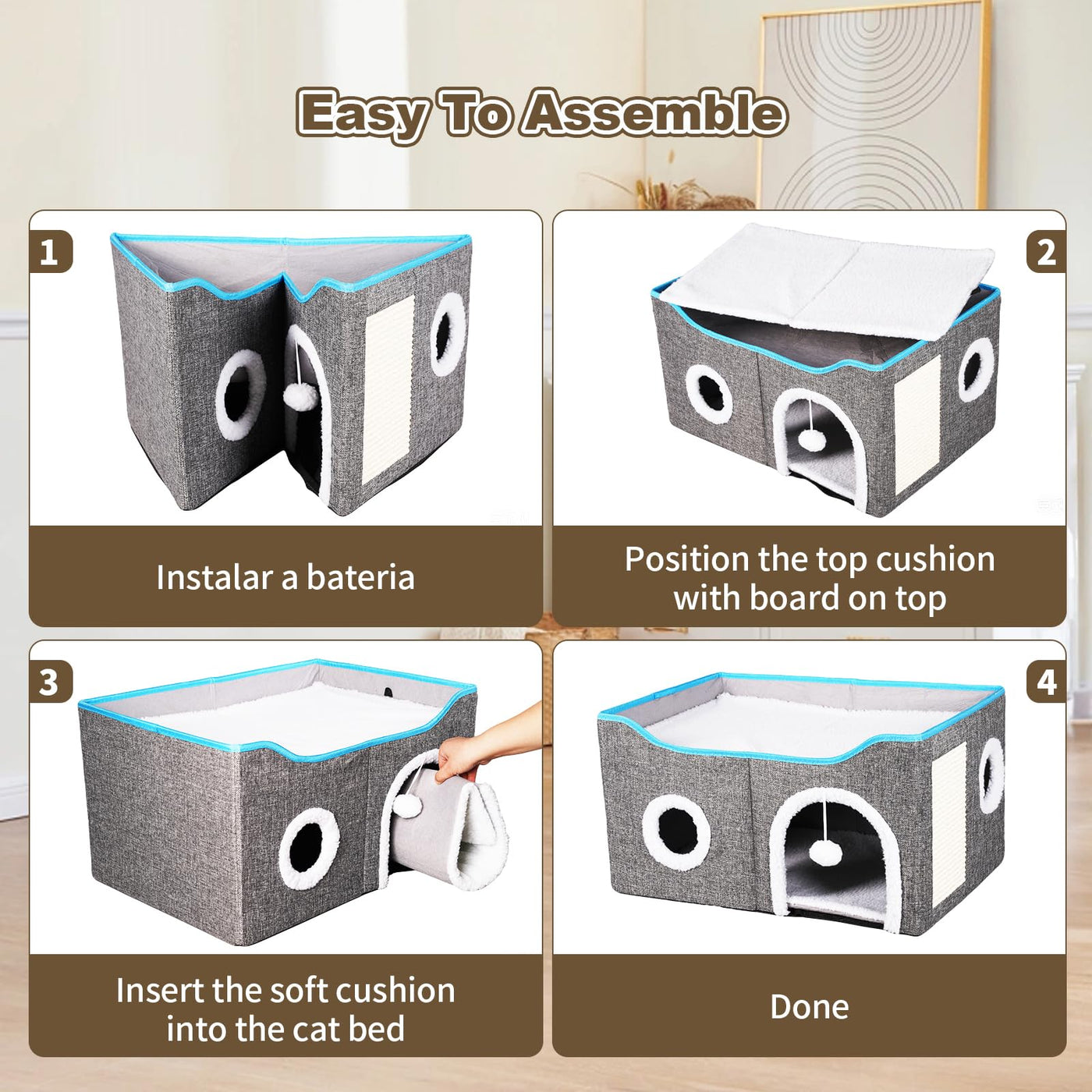Cat House For Indoor Cats - Foldable Cat Bed Cave With Scratch Pad, Fluffy Ball, And Cat Hole - Durable & No Sagging Cat Condo, Cat Hideaway For Multiple Kittens