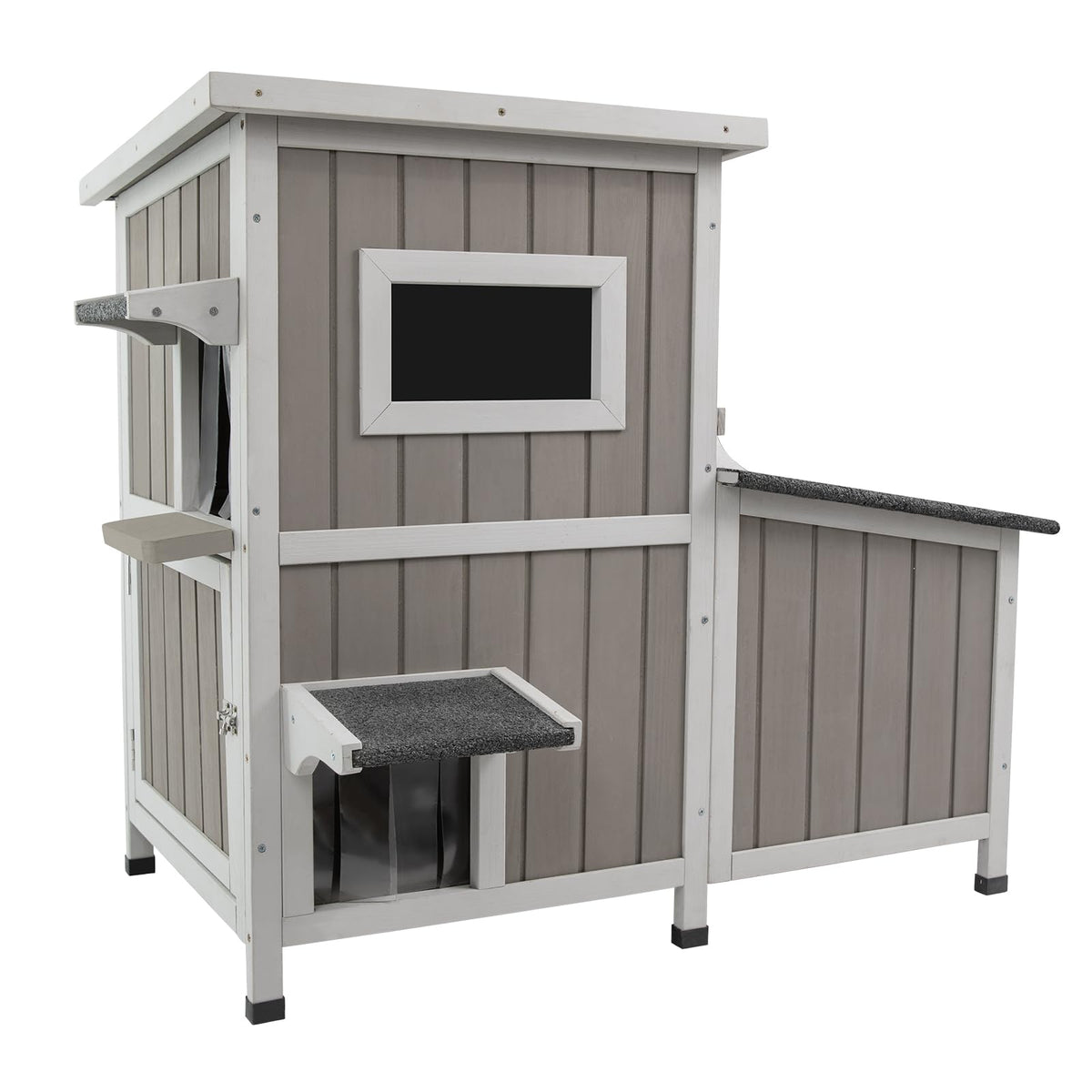 Two Story Outdoor Cat House Kitten Enclosures With 3 Rooms For Feral Cats The Cat House Made Of 100% Fir Wood Which Is Durable And Harmless To Pets. 2 Openable And Weatherproof Asphalt Roof,Waterproof Eave And Asphalt Material Enable Your Cat House To Be Fully Adapted Any Weather Conditions. 3 Resting Rooms, With 3 Spacious Space For Cats To Play, Relax, Sunbathe, Sleep And Fully Enjoy Their Outdoor Activities. Pvc Curtain Door,Door Flaps Protects Against Wind, Rain, And Cold. Pull-Out Intermediate Plate,Pulling The Floor Out Makes It Easy For You To Clean And It Creates More Space For Your Cat. The Wooden Outdoor Cat House Is Leak-Proof And The Waterproof Base Is Elevated Off Ground.The Roof Is Slanted So Rainfall Will Not Sit On Top. It Will Survive In Heavy Rain/Snow To Keep The Cat Warm And Dry Inside Sides Excape Doors,Professional Escape Door That Allows Your Cat To Escape Immediately In Case Of Any Emergency Our Cat Houses Have A Larger Size, And Cats Can Live Comfortably In A Wider Space. Perfect For The Ragdoll, Maine Coon Cat, Exotic, Persian, Devon Rex And Many Other Cat Breeds. Breed Recommendation: Small Animals Item Dimensions:38.7''L X 22.4''W X 33.8''H Capacity (Suggested Only): 3-4 Cats Indoor And Outdoor Use