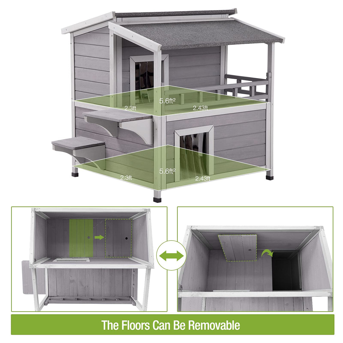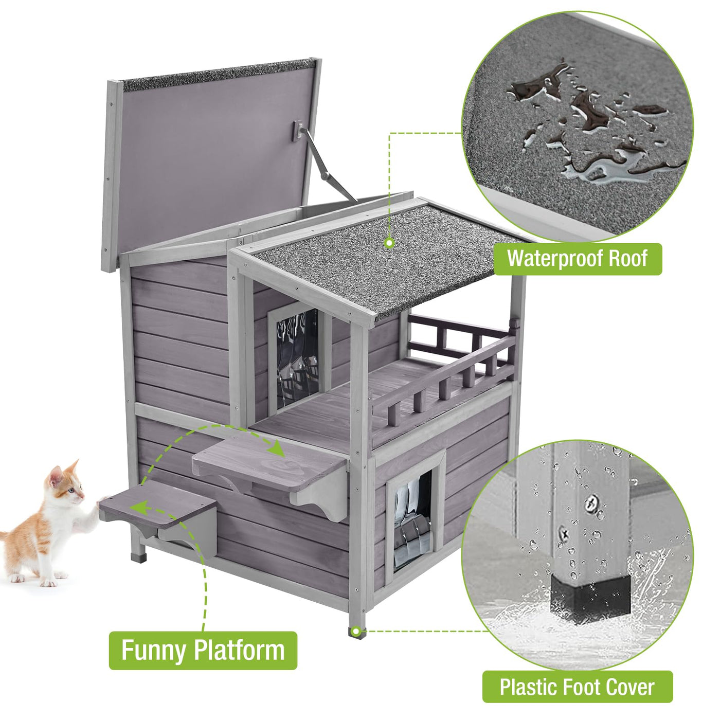 Cat House Outdoor & Indoor Feral Kitty House Cats Enclosure With Balcony Wooden Kitty Shelter Waterproof