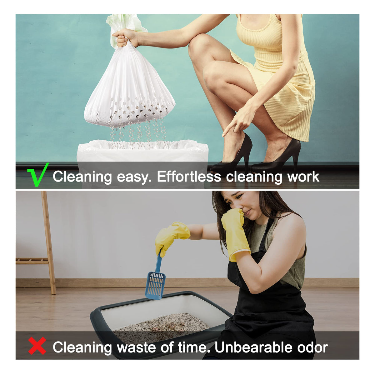 When you have furry kitty. I am sure you will have trouble cleaning cat litter. 1. the unpleasant smell you have to endure when shoveling cat litter. 2. Cleaning the litter is troublesome and time-consuming. 3. cleaning the litter box is particularly troublesome. 4. Poor quality litter bags cause litter to fall all over the floor. And we have this cat poop bags. It's the perfect solution for cleaning cat litter. This sifting litter box liners is perfect for the busy cat owner! 1.3s fast litter cleaning. 2.No need to put up with unbearable odor. 3.No need to clean the litter box. 4.Heavy jumbo litter box liners do not leak litter. Why choose us? ?cat litter bags 1 week scientific quantity design? The first 6 are sifting litter box liners, The last is a cat litter box liner without sieves. ?cat litter box liners with holes?kitty litter bags 76 filter holes can quickly filter cat litter. ?drawstring cat litter bags for poop?cat box liners Strong weight-bearing drawstring, Not easy to be torn off. ?Elastic litter liners? cat liners for litter box Drawstring design, not easy to run off, According to the size of each litter box, Can be freely adjusted. ?Hidden drawstring litter bags for cat poop? cat litter bag Drawstring can be hidden, Does not affect the cat's activities. ?Extra large litter box bags?cat litter bags liners Can with stand 52ib of cat litter.