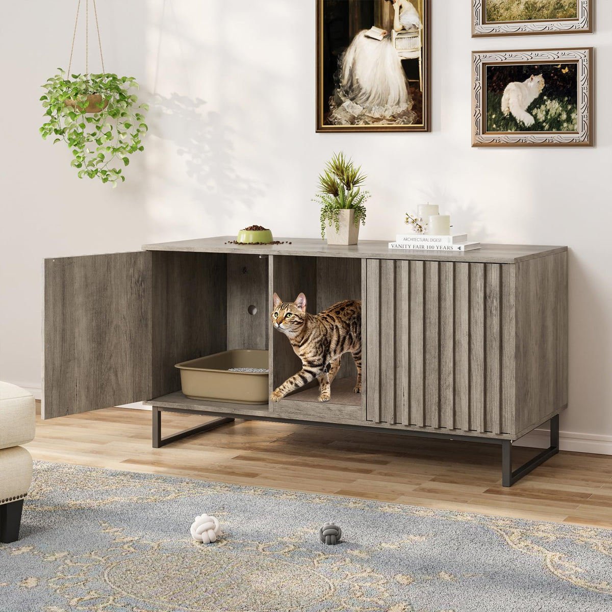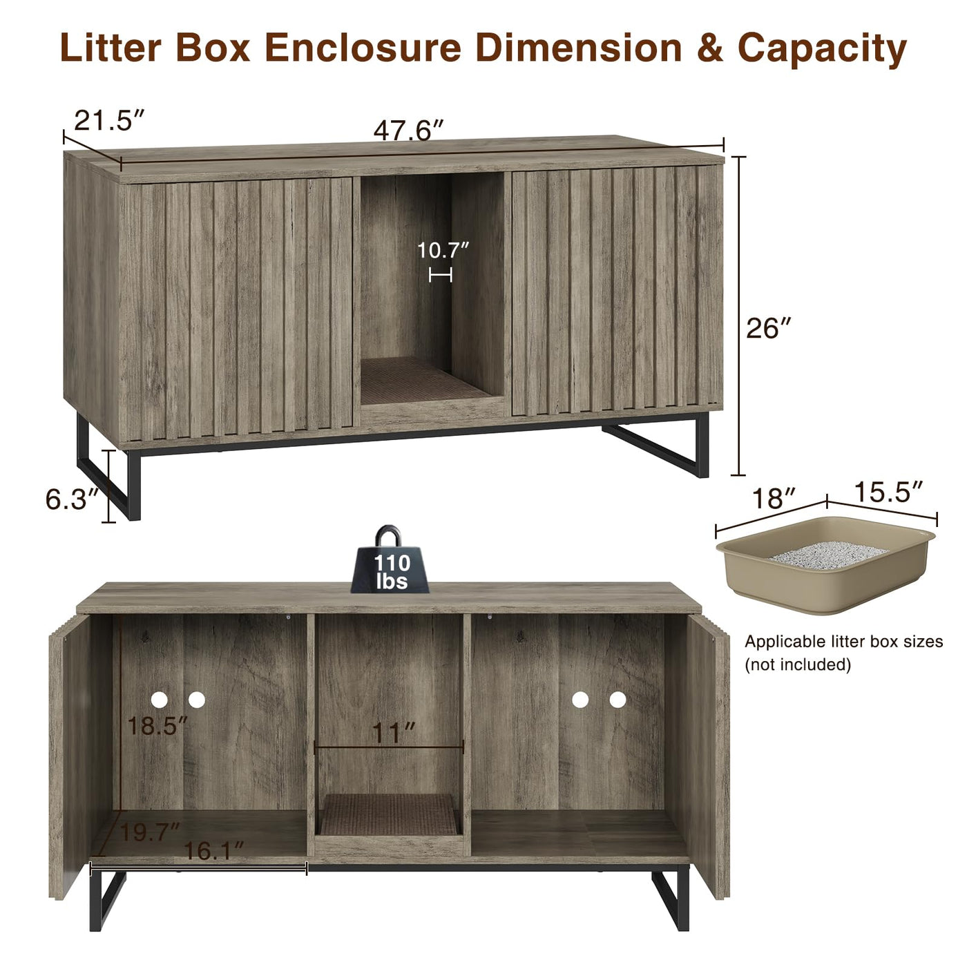 Descriptions Log Color Hidden Litter Box Furniture Can Not Only Be Used As A Cat House Or Litter Box, But Also Perfect For Home Decoration, Providing A Warm And Cozy Environment For Cats! Features -The Double Cat Litter Box Enclosure Consists Of A Solid Wood Effect Finish, Black Finish Iron Plate And Thick Solid Wood Fluted Panels For A Unique Look And Durability. -The Spacious Tabletop Can Be Used To Hold A Variety Of Household Items. -Ventilation Holes At The Back Of The Cat Toilet Cabinet Facilitate Ventilation. -The Entrance Is Equipped With A Cat Scratching Pad, Providing A Place For Cats To Sharpen Their Claws. -The Meandering Entrance In The Cat House Satisfies Cats' Nature Of Exploring. -The No Handle Pop-Up Door Allows The Door To Close Securely. -Thickened Steel Pipe Base Frame Provides Strong Support For The Cat Litter Box Enclosure. -Extra Large Hidden Cat Litter Box Is Set Up With Two Compartments That Can Accommodate Two Litter Boxes At The Same Time. Specification Material:Mdf,Steel Color:Grey Overall Dimension: 47.6''L*21.5''W*26''H Interior Dimensions: 16.1''L*19.7''W*18.5''H Weight Capacity :110 Lbs Assembly Required:Yes