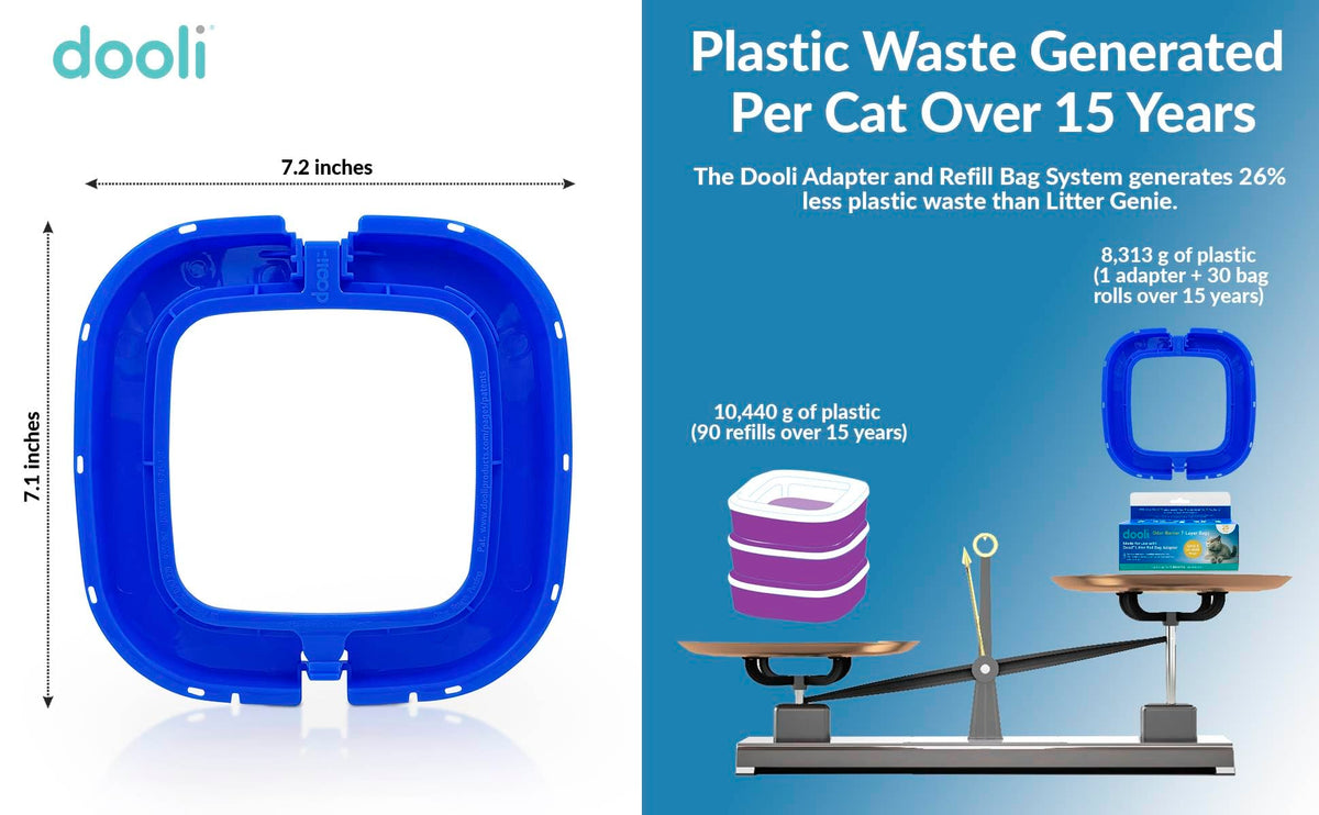 The Cat Litter Pail Bag Adapter by Dooli makes the process of changing bag refills even easier (and more affordable). Just snap in the Dooli Cat Litter Pail Bag Adapter and use with individually sized Dooli 7-Layer Refill Bags (sold separately) for a perfect fit and superior odor control. You can even use a standard trash bag - just make sure it is the appropriate size. Please note that a standard trash bag is not designed to hold the smell in the same as 7-layer bags. The Dooli Adapter is a smart, practical investment that reduces waste and makes litter disposal faster and easier. When your bag is full, simply tie a knot and toss -- no need to cut bags ever again! The Dooli Bag Adapter is reusable and can be left in your pail between bag changes. Please contact us should you have any issues or concerns. We are happy to help: info@dooliproducts.com. This product is not licensed, sponsored or endorsed by Playtex Products, Inc., Edgewell Personal Care, Energizer Holdings, Inc., or any affiliated companies. Founded in 2015, Dooli Products, Inc. is a family company focused on utilizing patents for improved waste management devices. 2021 Dooli Products, Inc. All Rights Reserved. * The Patented Dooli Litter Pail Bag Adapter is compatible with all Litter Genie, Litter Genie Plus, Litter Genie XL, Litter Genie XXL, and Pet Genie.