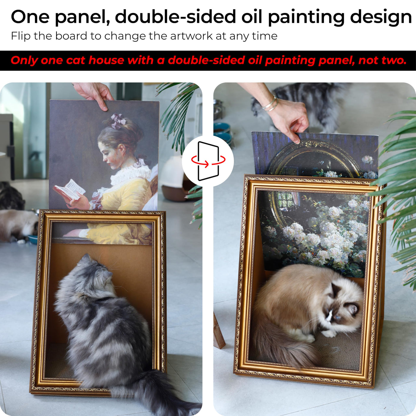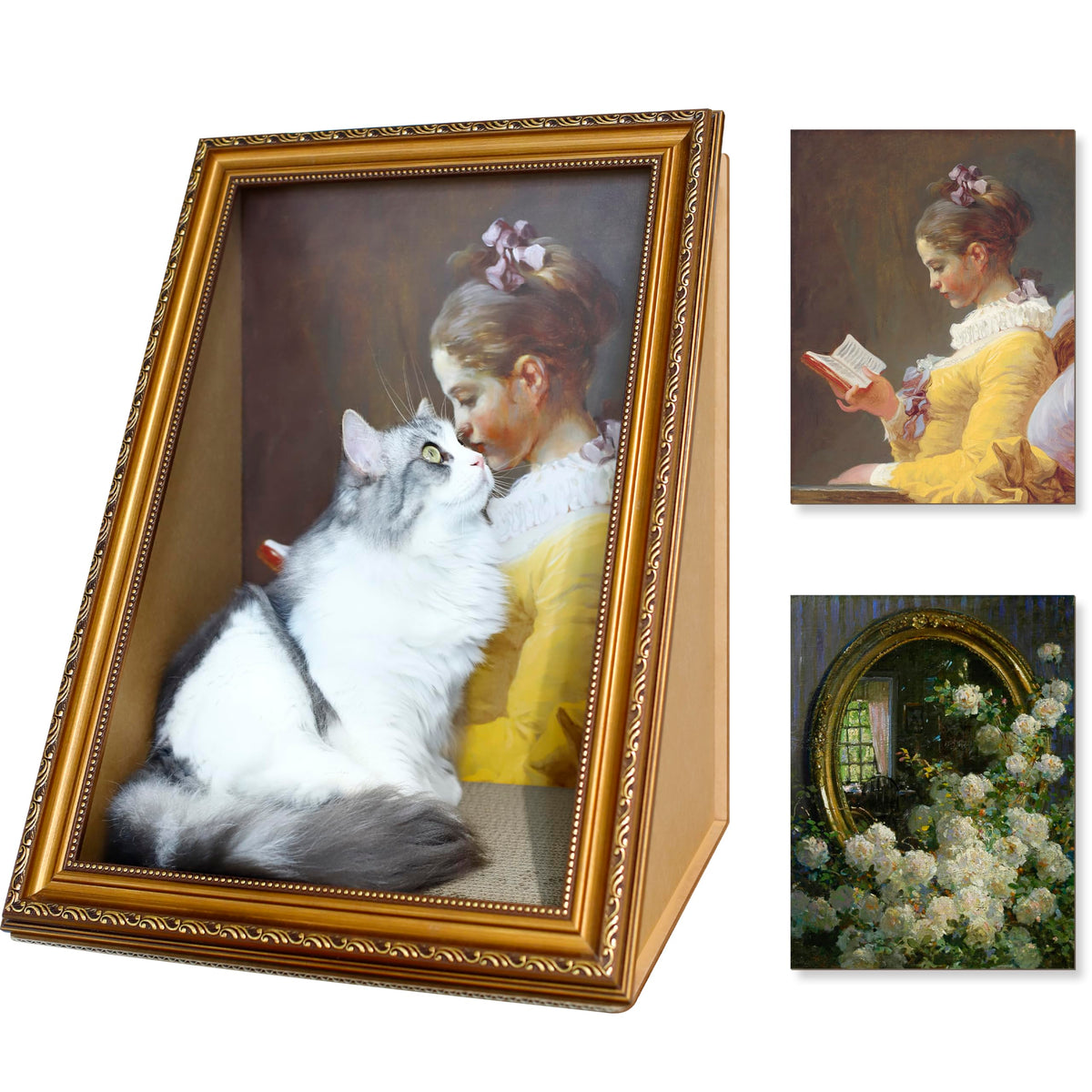 This Uniquely Designed Oil Painting Frame Cardboard Cat House Skillfully Blends The Needs Of Cats With Art, Adding A Unique Touch Of Art To Your Home Space. Made Of High-Quality Cardboard, Cats Can Not Only Enjoy Resting And Scratching In The Art Painting Cat House, But Also Feel Like They Are In A Beautiful Scene From A Famous Painting. Each Cat Bed Comes With A Double-Sided, Scratch-Resistant Oil Painting Print And Is Interchangeable, Allowing You To Change It According To Your Mood And Home Environment To Create Different Decorative Effects At Any Time. The Classic Oil Paintings The Reader And Flowers And Mirror Will Add Endless Artistic Charm To Your Space.The Main Body Of The Cat House Is Made Of Hard Cardboard, Which Is Environmentally Friendly And Resistant To Deformation, With A Weight Capacity Of Up To 50 Pounds, Ensuring Stable Use For A Long Time. The Specially Designed Replaceable Cat Scratching Board Not Only Extends The Life Of The Product, But Also Promotes An Environmentally Friendly And Sustainable Lifestyle. Whether As A Lounge Space Or A Scratching Toy, It Is A Favorite Choice For Cats.In Addition, This Cat Bed Cave Couch Features A Simple Patchwork Design That Makes It Easy For One Person To Assemble. The Cardboard Splice Structure Further Enhances The Overall Stability And Ensures That It Will Not Be Deformed After A Long Time Of Use. The Spacious Size Is Not Only Suitable For Cats, But Also Meets The Needs Of Small Pets Such As Small Dogs, Rabbits, Hamsters, Guinea Pigs And So On, Making It An Ideal Choice For All Kinds Of Pets At Home.With This Cleverly Designed Art Oil Painting Cardboard Cat House, Your Pet Will Enjoy A Comfortable Living Space While Experiencing The Charm Of Art And Enhancing The Unique Taste Of Your Home Environment.