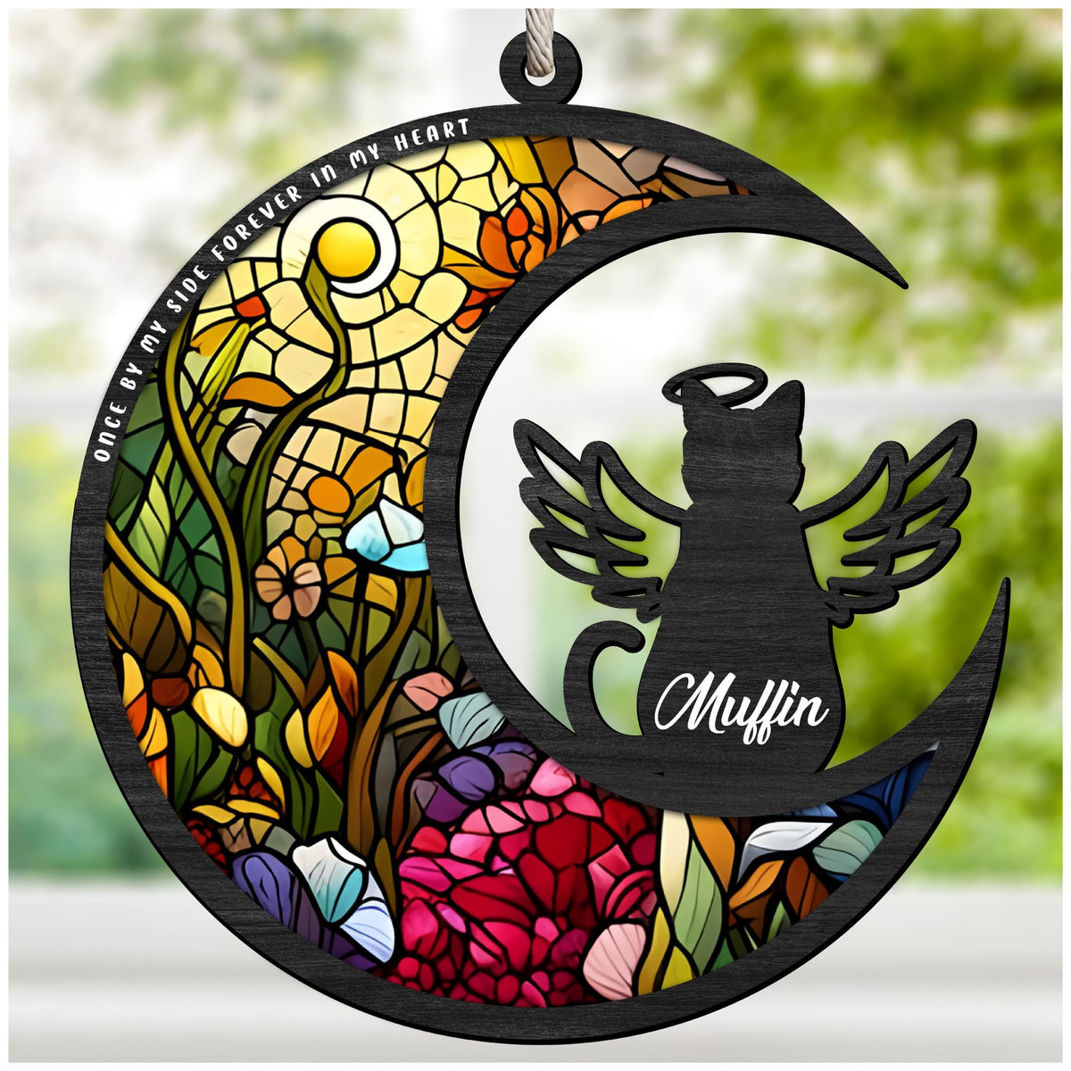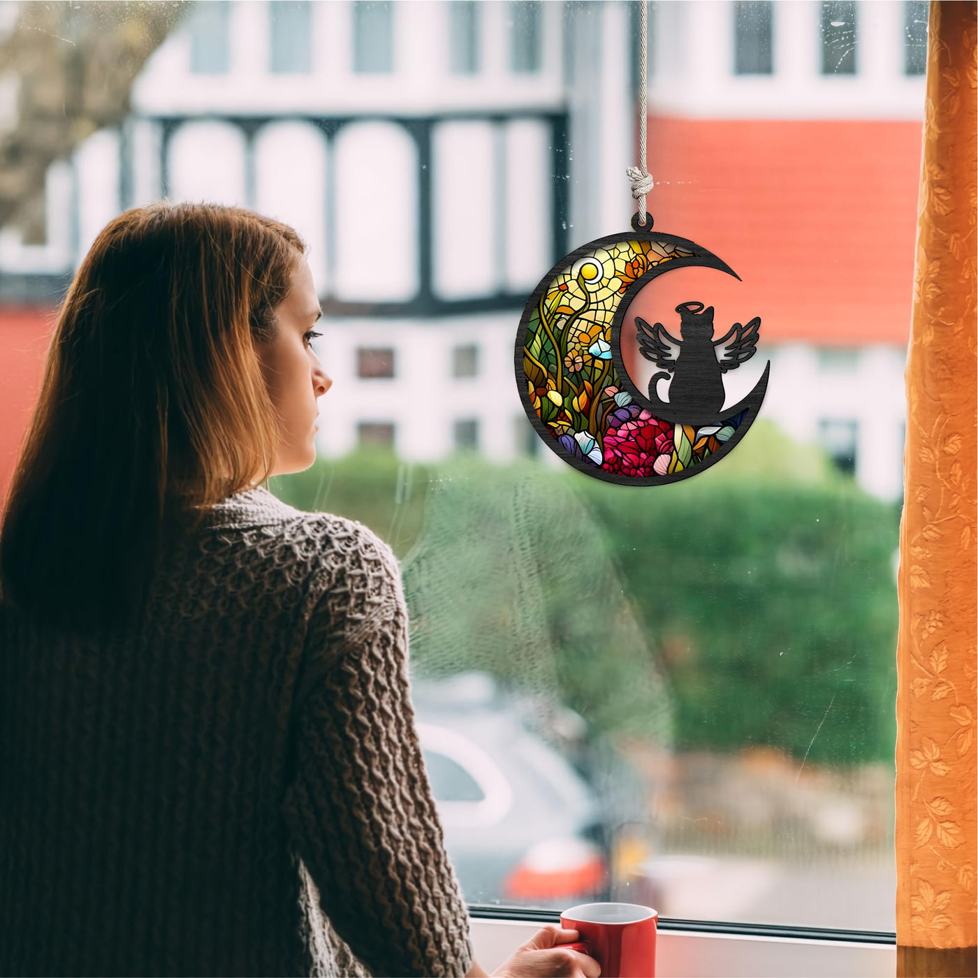 Q: Is the Cat Memorial Suncatcher suitable for outdoor use?A: The Cat Memorial Suncatcher is designed primarily for indoor use, as exposure to harsh weather conditions may damage the stained glass. It is best placed near a window where it can catch sunlight without being exposed to the elements.