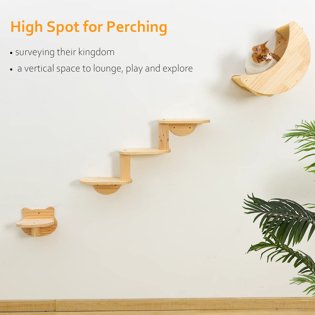 1.Creating A Funny Cat Heaven:An elevated cat is quite often a happy cat. This corner cat wall shelves not only gives them a space to climbing and jump but also give them a great vantage point to survey their kingdom, to play,snap and get away from that horrible dog. | 2.Great Idea for Space Saving:The wall mount cat furniture doesnt take up floor space and avoid more clutter on the floor in small apartment.The elegant moon design is eye-catching,catify your home without disturbing anyone sense of style. A win win for cats and you! | 3.Sturdy Wood Climbing Set:.Max load for 45lbs,great fit for large cats. Without any chemical smell and formaldehyde-Free. Easy to clean,less fur build up.Easily fit into both traditional and contemporary decorating styles. | 4.Multi-funcational Cat Wall System:Consists of a floating a moon bed,a ladder and a small platform. Creating a wall obstacles for cats , gives kitten plenty of play,lounge and sleep options. | 5.Assemble Required: The floating cat perch with stair and step need to assemble and drill holes in the wall to mount them. All hardware included. And please prepare a drill to assistant you.