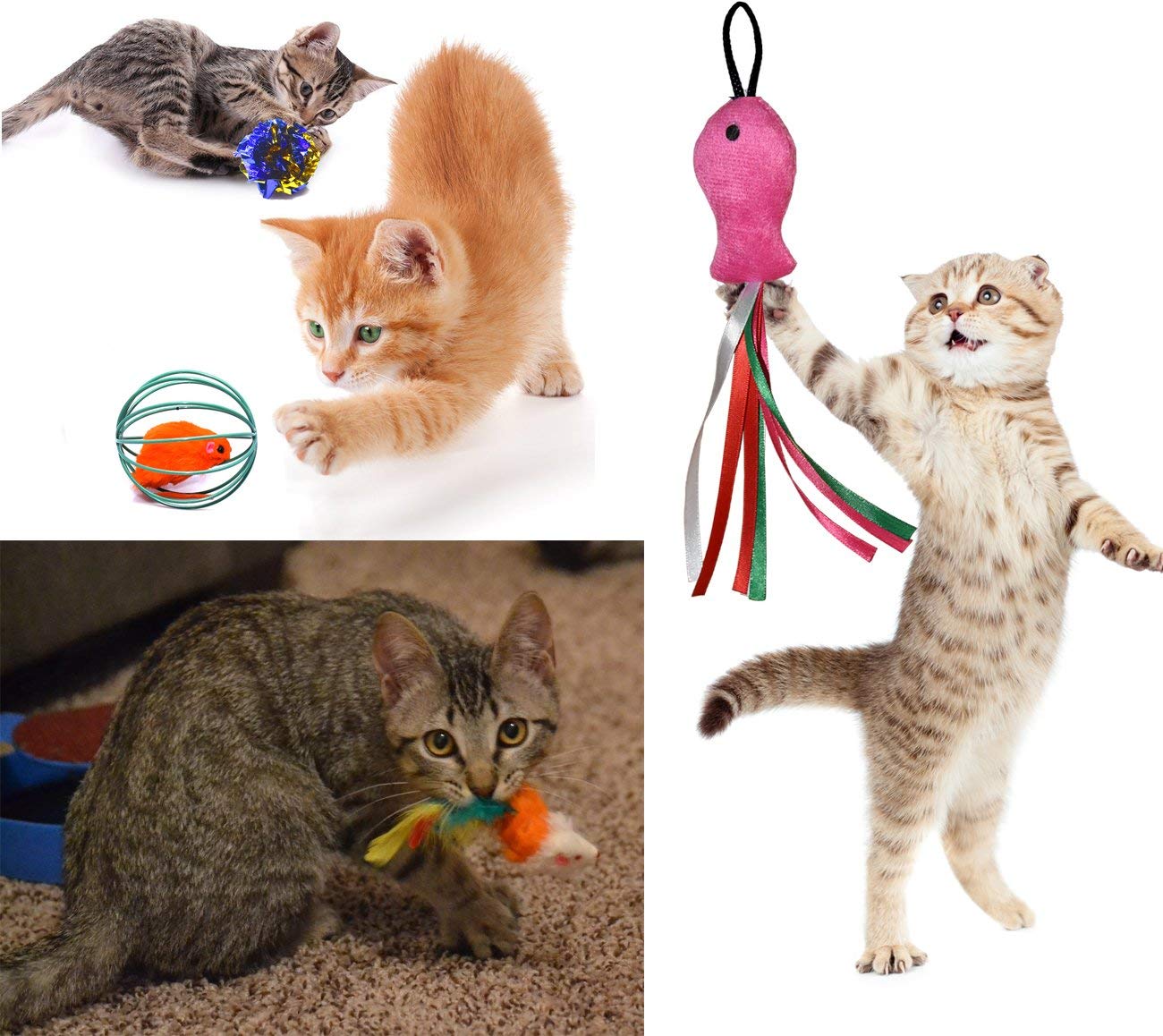 Whats In The Package? ----1X Cat Teaser Wand With A Dangling Fish And A Feather Strip To Replace; Lightweight:15G Three Length Option: Max:40In Min:15In Feather With A Bell To Stimulate The Most Of Your Cats Hunting Instincts, Helping Your Cats Stay Fit And Healthy ----1X Catnip Fish; Catnip Fish Stuffed With Crystal Pp Cotton And Built-In Organic Fresh Catnip. Size:7.5L About 70 Per Cent Of Cats Will Respond To The Active But Harmless Chemical In This Catnip Herb, By Miaowing And Rolling. ----1X Mouse-In-A-Rolling-Cage Ball; Super Tough Iron Ball With A Feather Mouse In It. ----2X Sisal Mice (2 Colors Sent At Random); ----2X Feather Mice With Feather Tails Or Strip Tails(2 Colors Sent At Random); ----2X Mylar Crincle Balls; Color Would Not Fade At All. Reasons Why Play With Your Cat---- It Provides Physical And Mental Exercise. It Prevents And Relieves Boredom. Its A Potent Stress Reliever. It Channels Restlessness And Is A Hedge Against Destructive Behavior. It Aids In Weight Maintenance. Its A Distraction From Frightening Noises Or Situations (May Help Lessen Fear). Its Pleasurable. It Strengthens The Cat-Human Bond. Tips On How To Play With Your Cat---- Play For A Few Short Sessions Every Day. Allow Your Cat To Catch And Grab The Toy At The End Of Each Game. Provide A Variety Of Toys At The End Of Each Session Tidy Away Toys With String, Or Anything That Might Present A Danger To Your Cat. Never Force Your Cat To Play Or Be Trained.