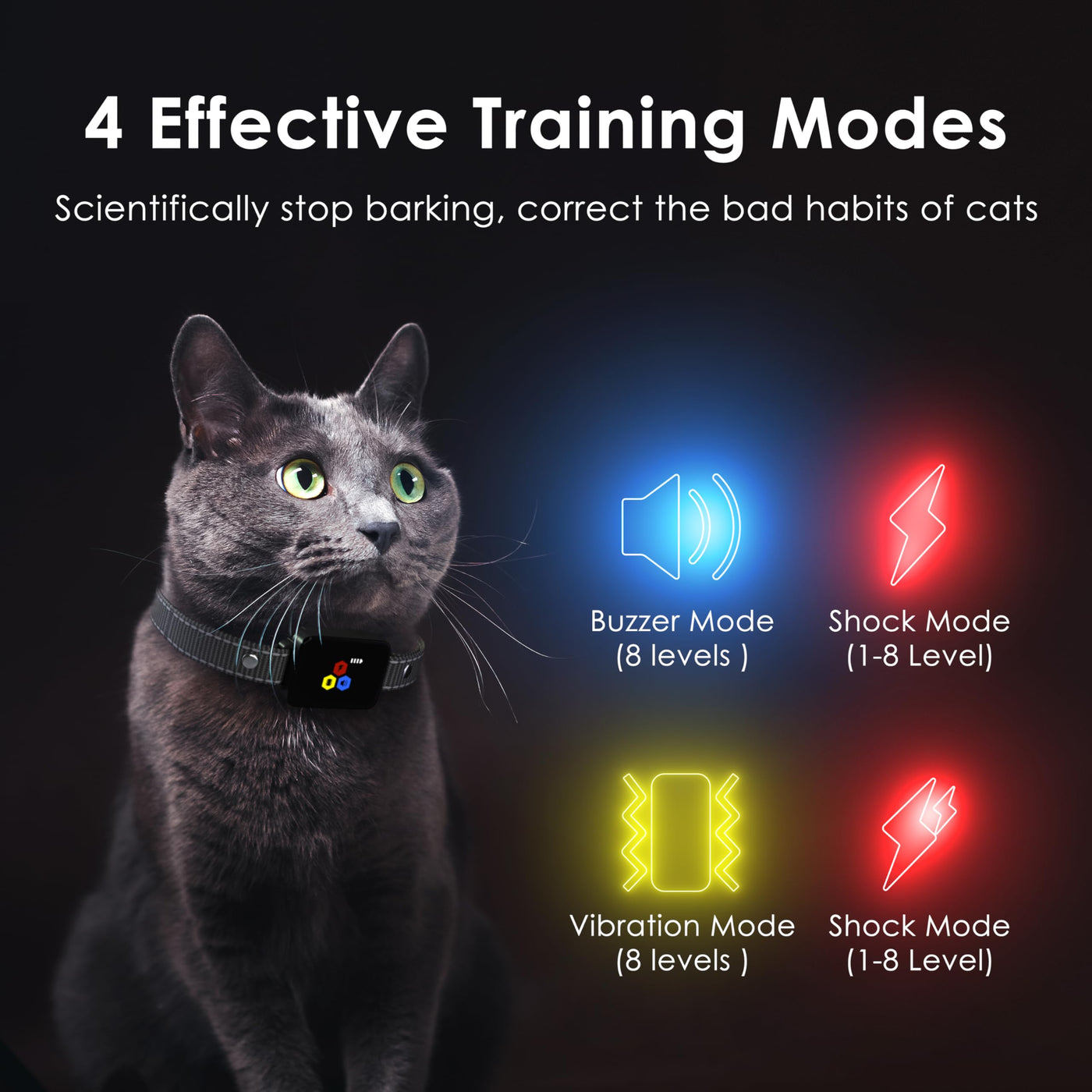 Professional Cat E-Collar With Remote Premium Cat Training Collar With Remote Safe And Effective Cat Training Tool For Professional Cat Trainers & Cat Owners! When Training A Cat, We Should Pay More Attention To The Cat'S Reaction Rather Than Looking At The Remote Screen. This Cat Training Collar Is Designed With Simple One-Handed Operation Without Looking At The Remote Is More Suitable For Training Cats. 3 Extremely Efficient Harmless Modes (Static Shock (0-8 Levels), Vibration (0-8 Levels), Beep) Intensity Adjustment Intuitive Button Layout (Blind Operation) Ip67 Waterproof Collar Receiver 3300 Ft Remote Range Rechargeable Remote & Receiver Type-C Charging Cable Receiver Is Magnetic Charging And Remote Is Type-C Charging Upgradation Magnetic Charging Is Faster And More Convenient 2 Hours Fast Charging Last Over 15 Days Features: - Up To A 3300Ft Range - Static Shock (0-8 Levels), Vibration (0-8 Levels), Beep 8 Types Of Sounds --- Low, Medium, And High Outputs --- Nick (Quick 0.01-Second) / Constant (Up To 12 Seconds) Of Correction --- Pager Vibration - One-Handed Operation --- Tube Shaped Remote - Waterproof And 2-Hour Rapid Charge Batteries - Contact Points : The Belt Of The Cat Bark Collar Can Be Adjusted From 5 To 18 Inches - Suitable For Small, Medium, Large Cats, From 5 To15Lbs Cats. Package Contents: 1* User Manual 1* Remote Transmitter 1* Collar Receiver 2* Nylon Collar Strap 2* Contact Prongs 4* Safe Silicone Caps (2* Long, 2* Short) 1* Test Light 1* Type-C Charger Cable
