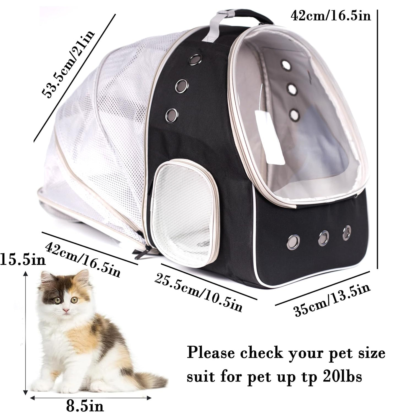 Large Backpack For Cat: Pet backpack dimension is 13.5*16.5*27 inches after expanding the back fits cats up to 12 pounds and puppy up to 10 pounds. Back extension is proper for pet to rest indoor as a bed.