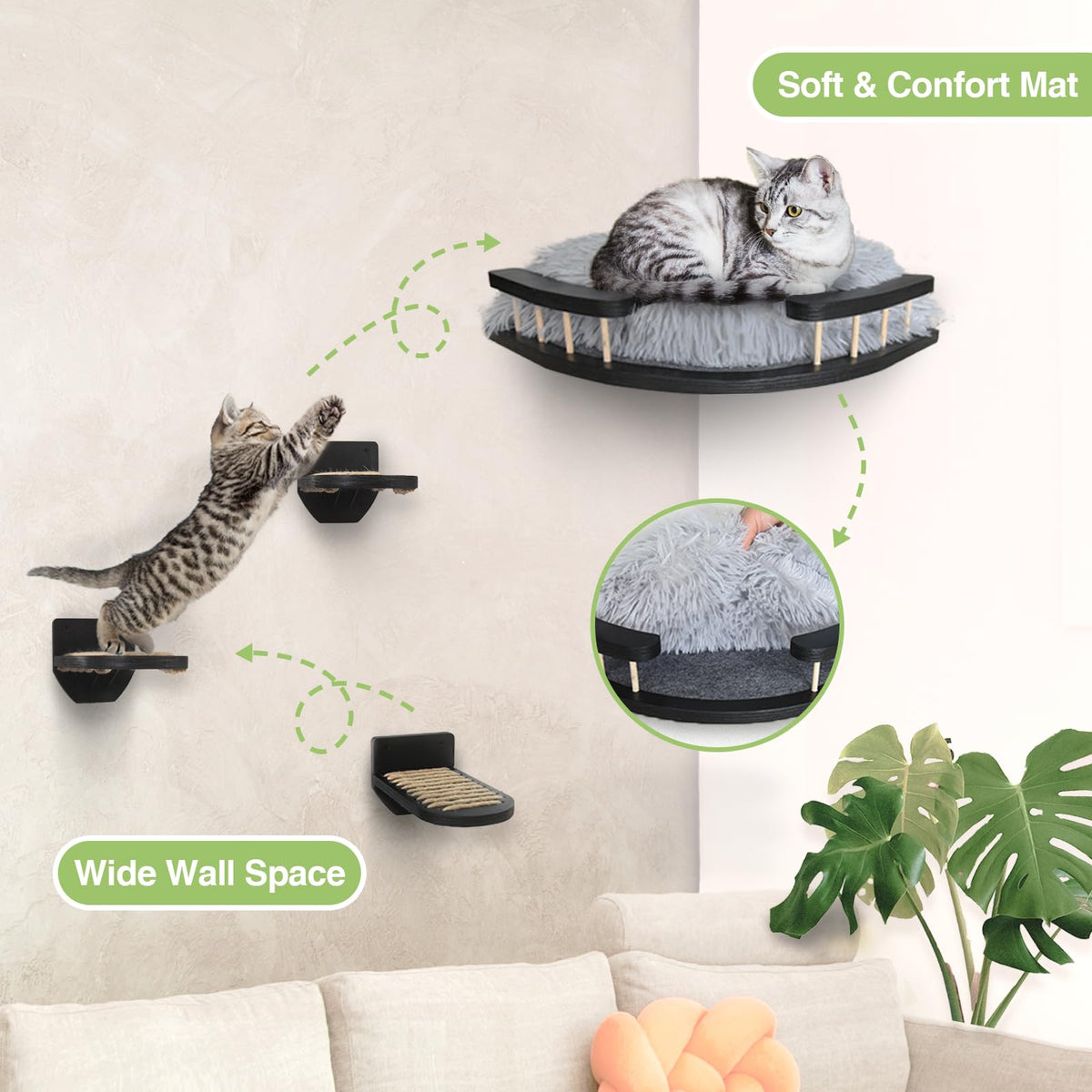 ?Product Highlight??Unique Design Cat Shelves With Plush Cushion?Our Cat Shelves Are Specially Designed By Designers Who Love Animals To Provide Thoughtful Service For Your Cats. The Cat Wall Shelves Set Consist Of The Cat Perches And 3 Cat Wall Steps, And The Shelves Set For Cats Was Wrapped With Hemp Rope, So That Your Pet Can Play With It And Rest Well. You Can Install It In The Corner Of The Wall And Bring These Three Stepping Boards With You So That Your Cat Can Play In Your Own Private Area.&Nbsp;&Nbsp;?Creating A Unique Wall Cat Playground Set?The Cat Shelf For Wall Doesn'T Take Up Floor Space And Are Ideal For Small Or Modern Room, Which Can Effectively Save Space. This Cat Wall Furniture With Scratching Pad For Indoor Not Only Offers Kitty A Space To Climb And Jump But Also Reduces The Cat'S Impact On The Living Space. Brown-Black Style And Modern Design Easily Fit Into Both Traditional And Contemporary Decorating Styles. It Is A Nice Pet Furniture For Anyone Who Owns Cats.?Product Dimension?Color: Blackmaterial:100% Mdf Wood, Metal,Hemp Rope