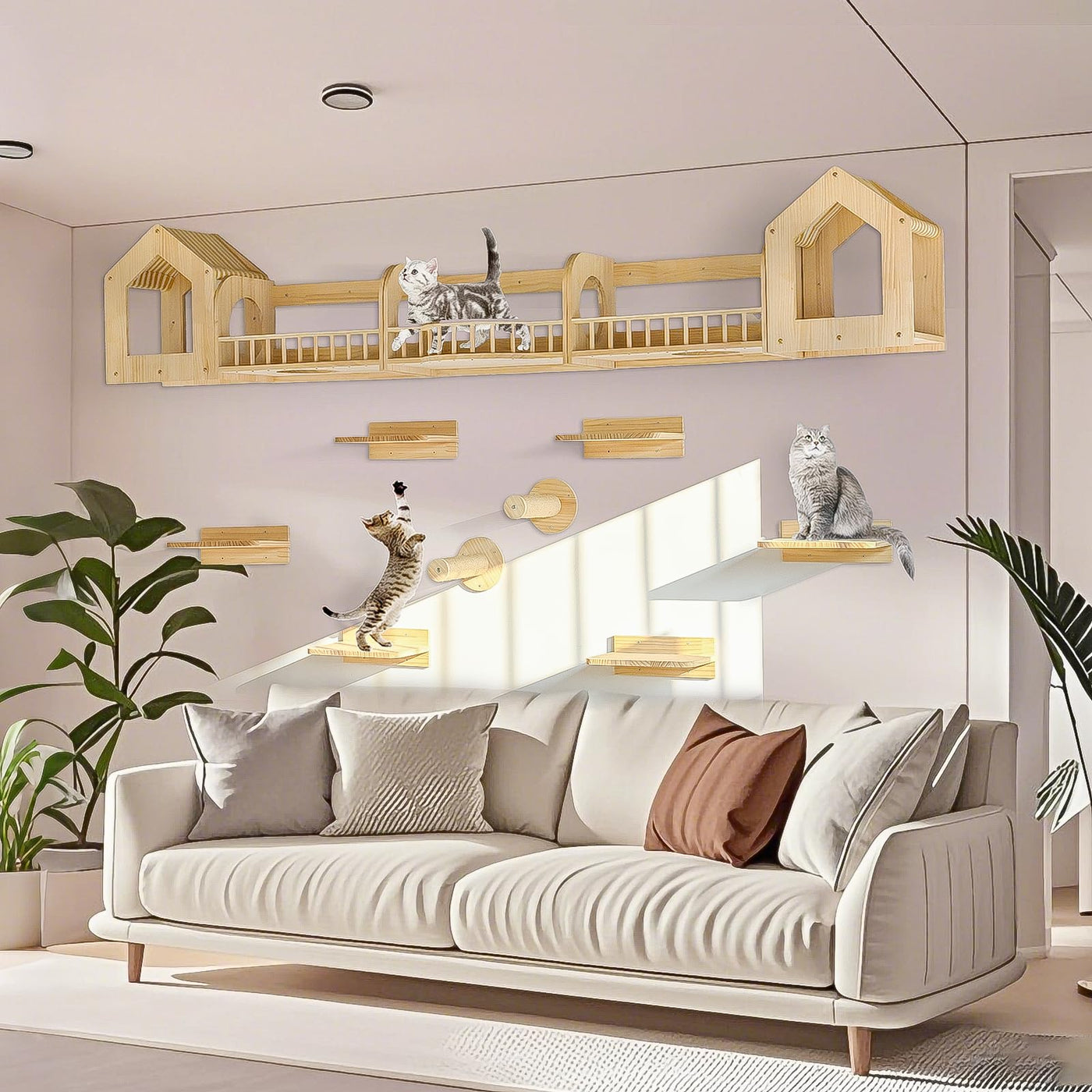 Are You Still Worrying About These Problems? The space at home is small and limited, clutter occupies a lot, cat activities are restricted, cats are boring and feel uninteresting. If you have one or even more of these problems, you can choose this cat shelves. This Cat Wall Shelves can effectively solve your issue. Cat ledges can effectively save your precious floor space, but also allow your cat to play, sleep, climb, let the cat enjoy the fun of play. Cat wall shelves are also decoration for your home, and I am sure your cat would like this furniture. A set of wall mounts for cats to jump, climb, sharpen their claws and rest. Including 6 Cat Shelves & 2 Cat Houses & 2 Ladders & 1 Cat Scratching Post, you can arrange the installation position according to the habits of your cats by using common accessories, it means you can modify the arrangement it yourself. The main material of this cat ledge is pine, which allows cats to grind their teeth and claws. One board can hold up to 30 pounds. If you have more than three cats at home, please be careful not to let them fight on the same board. When installing, please be careful not to install on a hollow wall to avoid the screws penetrating the wall and causing the board to loosen. Most cats like to climb to high places, but please be aware that a small number of cats may not climb down safely. If you are not sure if your cat will be injured when jumping off the cat wall shelf, please install this cat wall shelf near a sofa or other cushioned furniture Specification: Material: Pine Wood, Can Hold at Least 30 LBS Package Content: 6* Cat Shelves 2* Cat Houses (23.6x 11.8 x 7.9) 2* Cat Ladders (25.6) 1 x Cat Scratching Post(11.8) 1* Instruction Manual