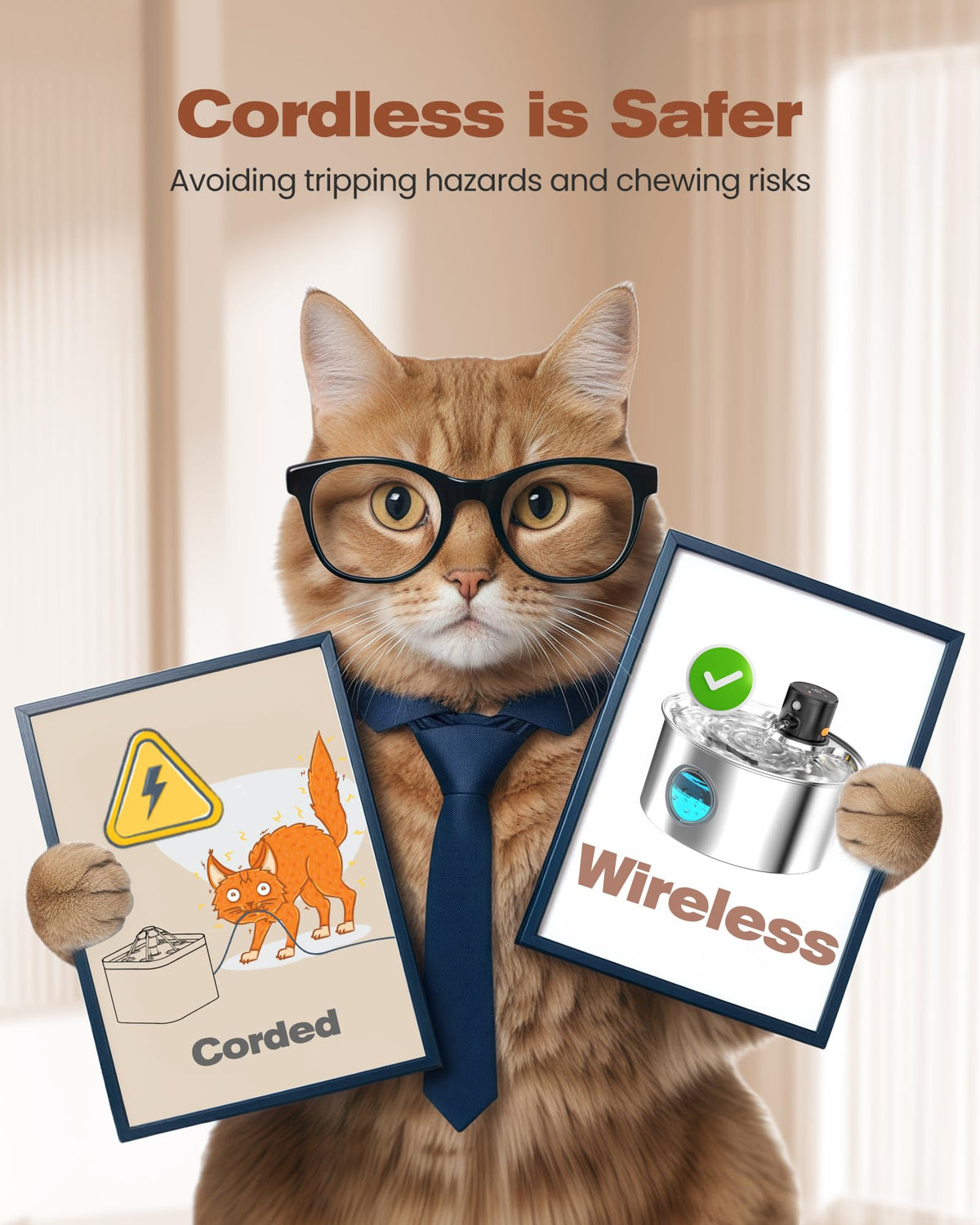 Cats Are Naturally More Interested In Flowing Water, And Animal Water Fountain Cordless Can Encourage Them To Drink More Frequently, Which Helps Keep Cats Hydrated And Reduces The Risk Of Urinary Tract Diseases And Kidney Problemsnew Experience For Pets Drinking Water: Wireless Cat Water Fountaindrinking Fun: Induction Mode, Timing Mode And Continuous Mode.Extremely Long Battery Life: Battery Cat Fountain Has A Maximum Standby Time Of 60 Dayshealthier: Battery Operated Cat Fountain Uses 304 Stainless Steelsilent Operation: Cat Fountain Cordless Creates A Quiet Living Space For Youpure Choice: Cat Water Fountain Rechargeable Uses Quadruple Filtrationcleaning Without Worries: Cat Fountain Stainless Steel Wireless Is Easy To Maintainwelcome To Bring Cat Water Fountain Inductor To Your Home, It Is A Paradise For Cats To Meet Their Drinking Needs. This High-Quality Cat Water Fountain Motion Sensor Is Designed For The Health And Comfort Of Cats.What'S In The Box?1X Cat Drinking Fountain1X Pump1X Carbon Filter1X Sponge Filter1X User Manual1X Brushtips1. Soak The Filter In Water For 5 Minutes Before Use And Clean All Parts.2. To Extend The Life Of The Water Pump, The Water Level In The Cat Drinking Fountain Should Be Higher Than The Water Level In The Water Pump, And The Water Pump Should Be Cleaned Every Two Weeks.3. We Recommend Replacing The Filter Every 2-4 Weeks To Keep The Water Clean.4. Disconnect The Power Supply Before Maintaining And Cleaning Cordless Pet Fountain Dogs. Do Not Rinse/Soak The Main Control Module With Water.5. If Rechargeable Cat Drinking Fountain Does Not Work, Please Contact Us.
