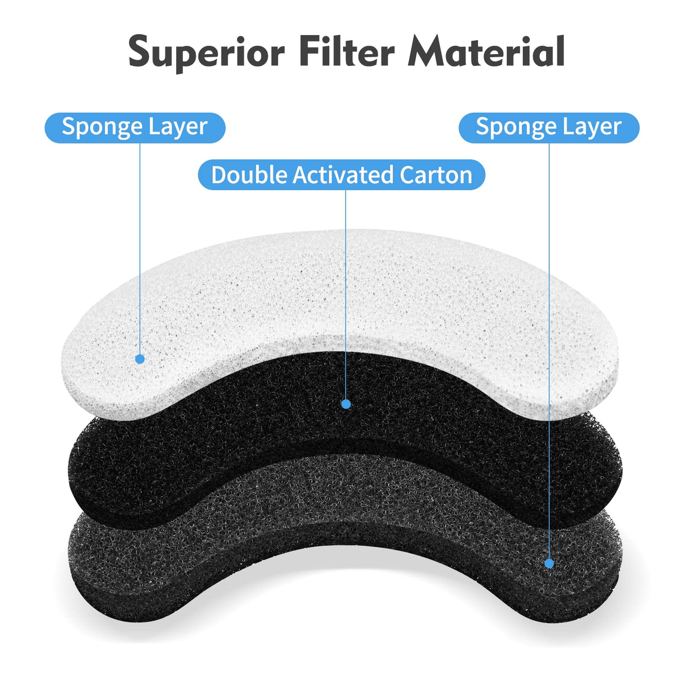 Compatibility: Compatible with WF050 & WF100 cat water fountain fountains. | Premium Filtration System: High-density and high-content activated carbon filter effectively to filter hair, heavy metals. keeping your pet's water clean and fresh. | Arc-Shaped Filter Size: Size is 4.5 in long and 2.25 in wide. Filter thickness is about 0.75in. | Package: The Pack Includes pack of 12 cat fountain replacement filters. | Note: Please soak 5 minutes foam filter before use. Replace filter every 2-4 weeks.