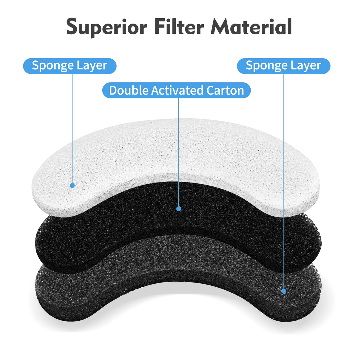 Compatibility: Compatible with WF050 & WF100 cat water fountain fountains. | Premium Filtration System: High-density and high-content activated carbon filter effectively to filter hair, heavy metals. keeping your pet's water clean and fresh. | Arc-Shaped Filter Size: Size is 4.5 in long and 2.25 in wide. Filter thickness is about 0.75in. | Package: The Pack Includes pack of 16 cat fountain replacement filters. | Note: Please soak 5 minutes foam filter before use. Replace filter every 2-4 weeks.
