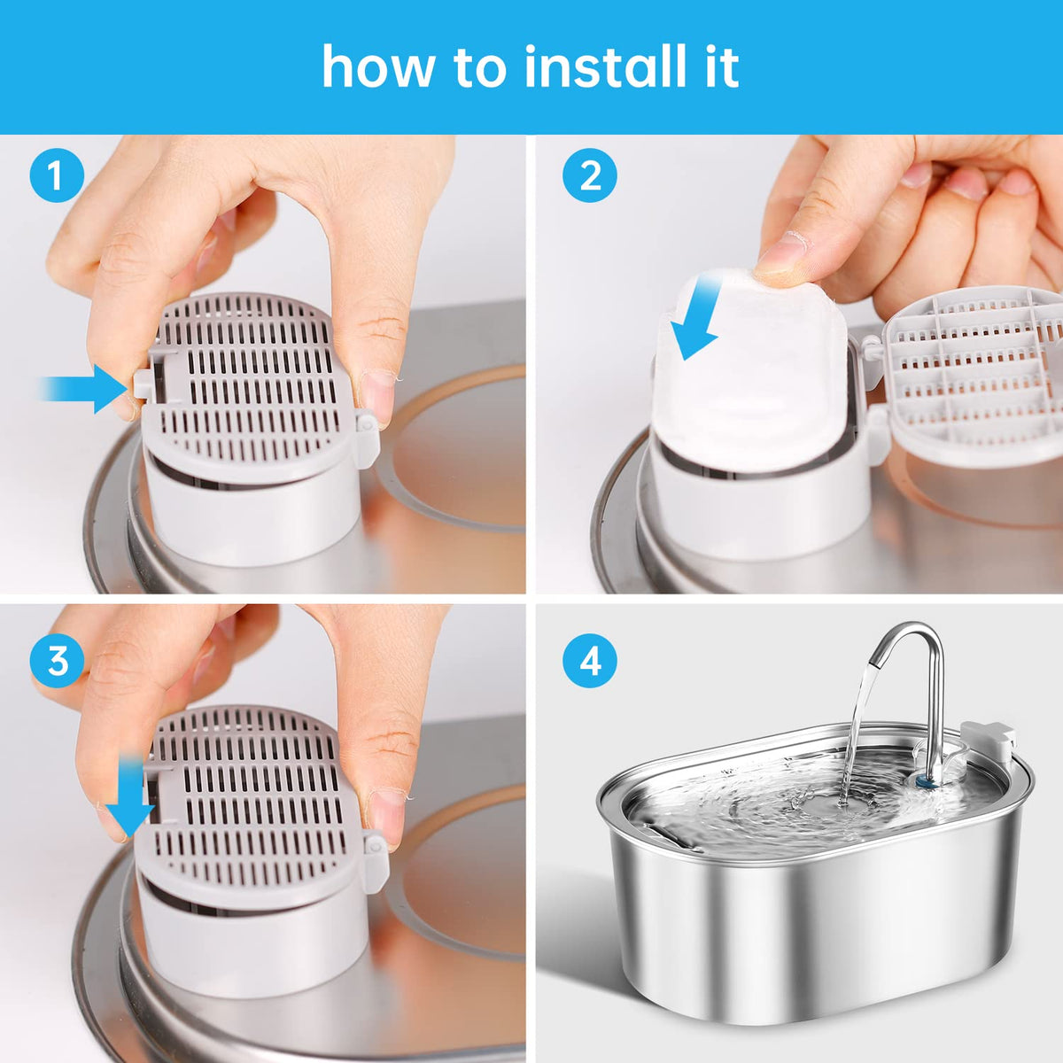???EASY TO REPLACE?: Easily remove the filter case from the pet water dispenser. It is recommended that the filter be replaced every 2 weeks to maintain proper operation to avoid hair debris getting stuck in the pet water fountain;