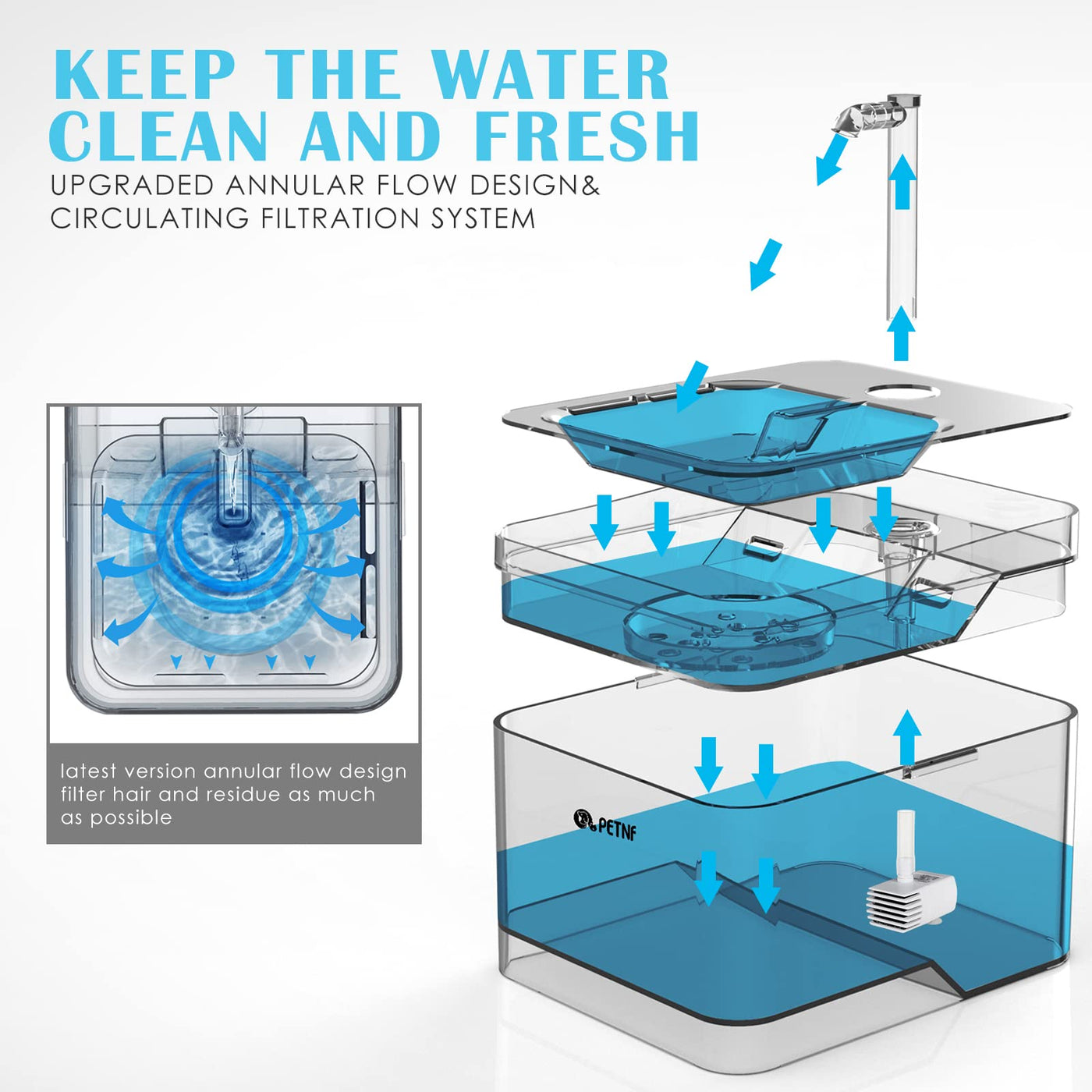 Q: What materials are used in the construction of the pet water fountain?A: The PETNF water fountain is made from high-quality, BPA-free ABS plastic, ensuring it is durable, non-toxic, and safe for your pets.