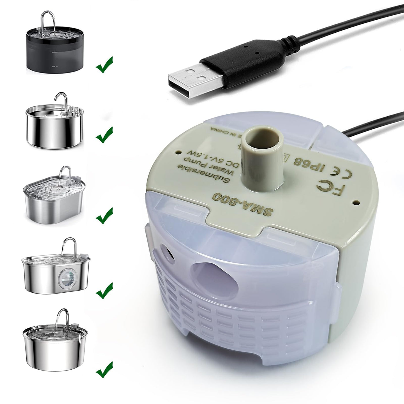 compatible Multiple Types Pet Water FountainThe cat water fountain replacement pump are designed compatible with different types pet water fountain Please refer to the original water pump label and dimensions before purchasingOur pet fountain pump label is: SMA-800 Ultra Quiet & Low consumption upgraded Pump15W low power consumption & super silent cat fountain replacement pump give you and your pets sweet sleep Long Life Spanc 5V low voltage IP68 Waterproof USB Plug for various applications--can be used for portable charger computer and so onPlease use 5V1A USB power adapters (USB adapter is not included in the package) Overvoltage can damage the pump Strong Suction cups for Easy InstallationThe cat water fountain pump have 59ft long power cable and 4 strong suction cups easy to install Serviceclean the cat water dispenser pump every 2 weeks the low water level or the entry of pet hair debris into the pump will cause the pump to work abnormally Please add water in time or disassemble the pump for cleaning If the pump is broken you can contact us to replace it with a new one We provide a 60-day refund and 12-month warranty If you have any questions please contact us in time
