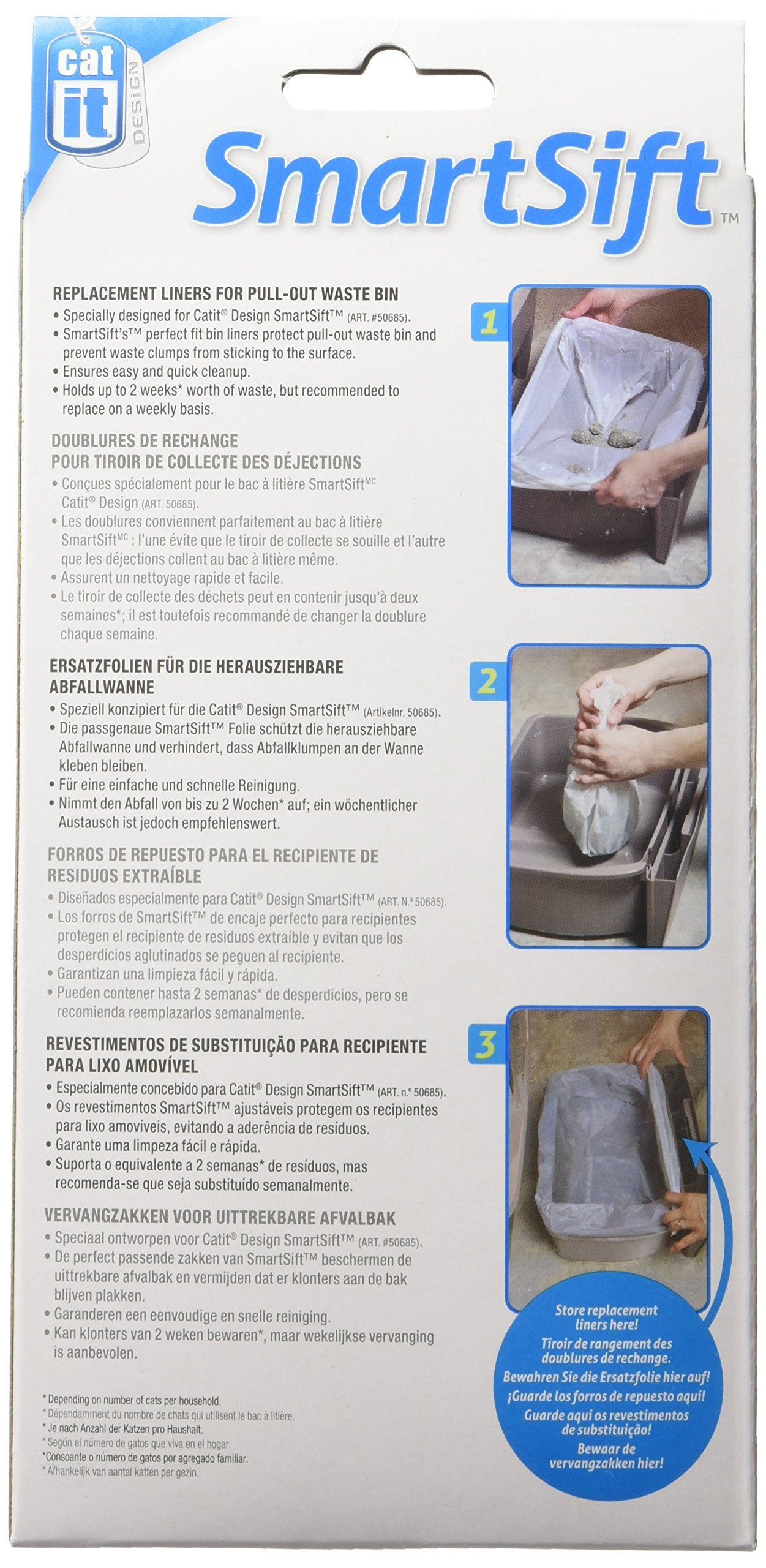 Specially designed for Catit Design SmartSift, these biodegradable replacement liners make managing your cat's litter very convenient. Easy to install, the liners are designed to fit perfectly in the waste bin. They are very effective at preventing waste clumps from sticking to the waste bin's surface, making cleanups so much easier. When the liner is full, simply remove and discard it. The liners will degrade in an organic or regular landfill. They can hold up to 2 weeks worth of waste.