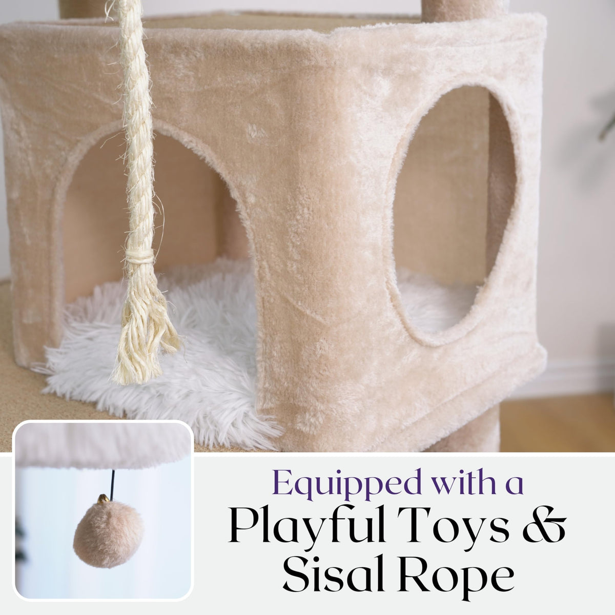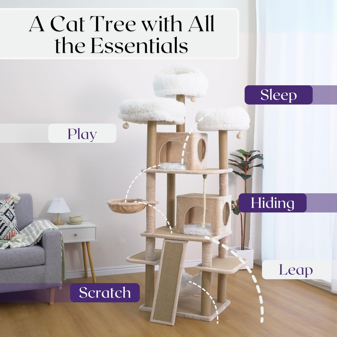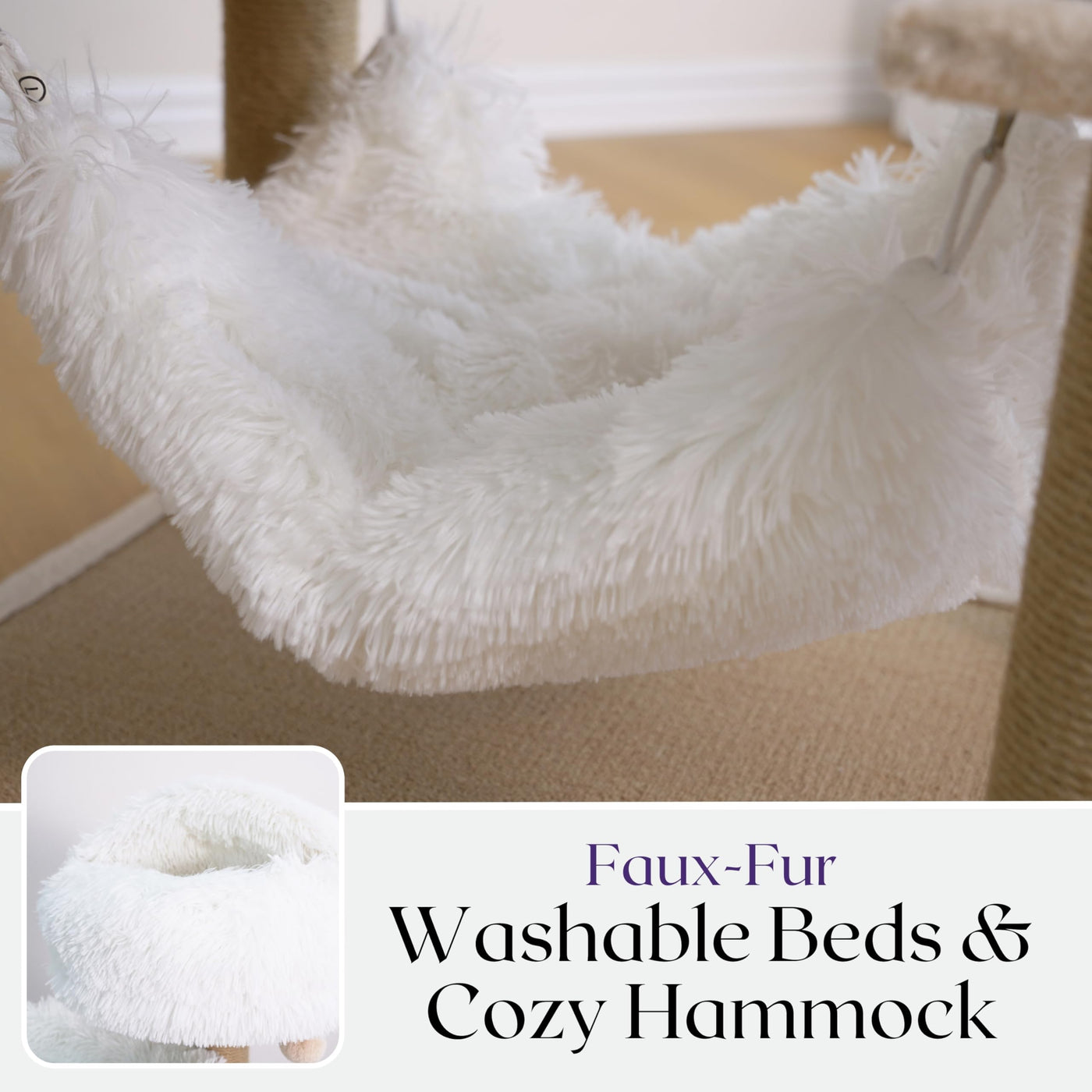 The Catry All-In-One Castle Cat Tree Is A Towering Retreat Designed To Meet The Needs Of Large And Senior Cats. With Seven Spacious Levels, It Offers Endless Opportunities For Climbing, Lounging, And Playing-All In One Sturdy Structure. Featuring Three Washable Faux-Fur Beds, Two Soft Condos, And Two Cozy Hammocks, This Cat Tree Provides Plenty Of Plush Comfort For Multi-Cat Households Or Extra-Large Feline Friends. Jute Rope Scratching Posts And A Sisal Pad Encourage Healthy Scratching Behavior While Helping Protect Your Furniture. With Included Teaser And Rope Toys, It Keeps Cats Entertained And Stimulated. The Neutral Color Palette And Sleek, Modern Design Make Castle A Stylish And Functional Centerpiece In Any Room.