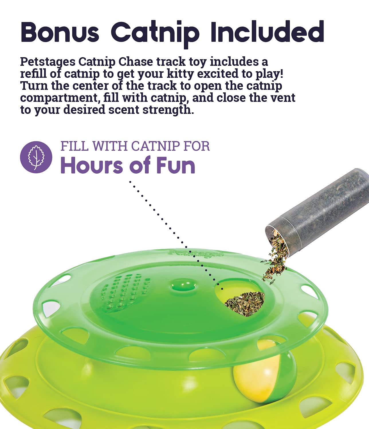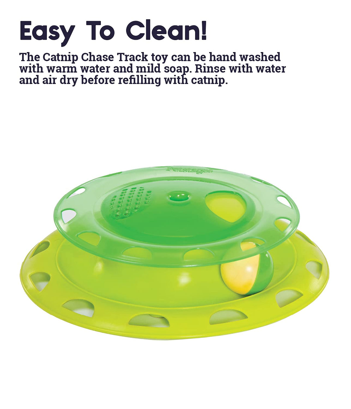 Petstages Catnip Chase Track cat toy is designed to keep your kitty active and engaged while playing indoors. Great for one or more more cats! This fun, brightly colored toy features a spinning ball that your kitty will have a great time chasing along a circular track. Peek-a-boo openings provide glimpses of the ball as it races around enticing your cat to bat and paw! This toy also includes a refillable catnip compartment to get your kitty excited for play time. A free bonus fill of catnip is included. Clean with warm water, mild soap and rinse. Dry before refilling center compartment with catnip. Wipe clean with a damp cloth SAFETY AND CARE: When choosing a toy, make sure to choose the appropriate size for your cat. No toy is indestructible. ALWAYS supervise your cat when using a toy of any kind. Inspect toys regularly for damage and remove if broken, or if parts become separated, as serious injury may result. Intended for cats only. Keep out of reach of children. This item is not recommended for cats that chew heavily.