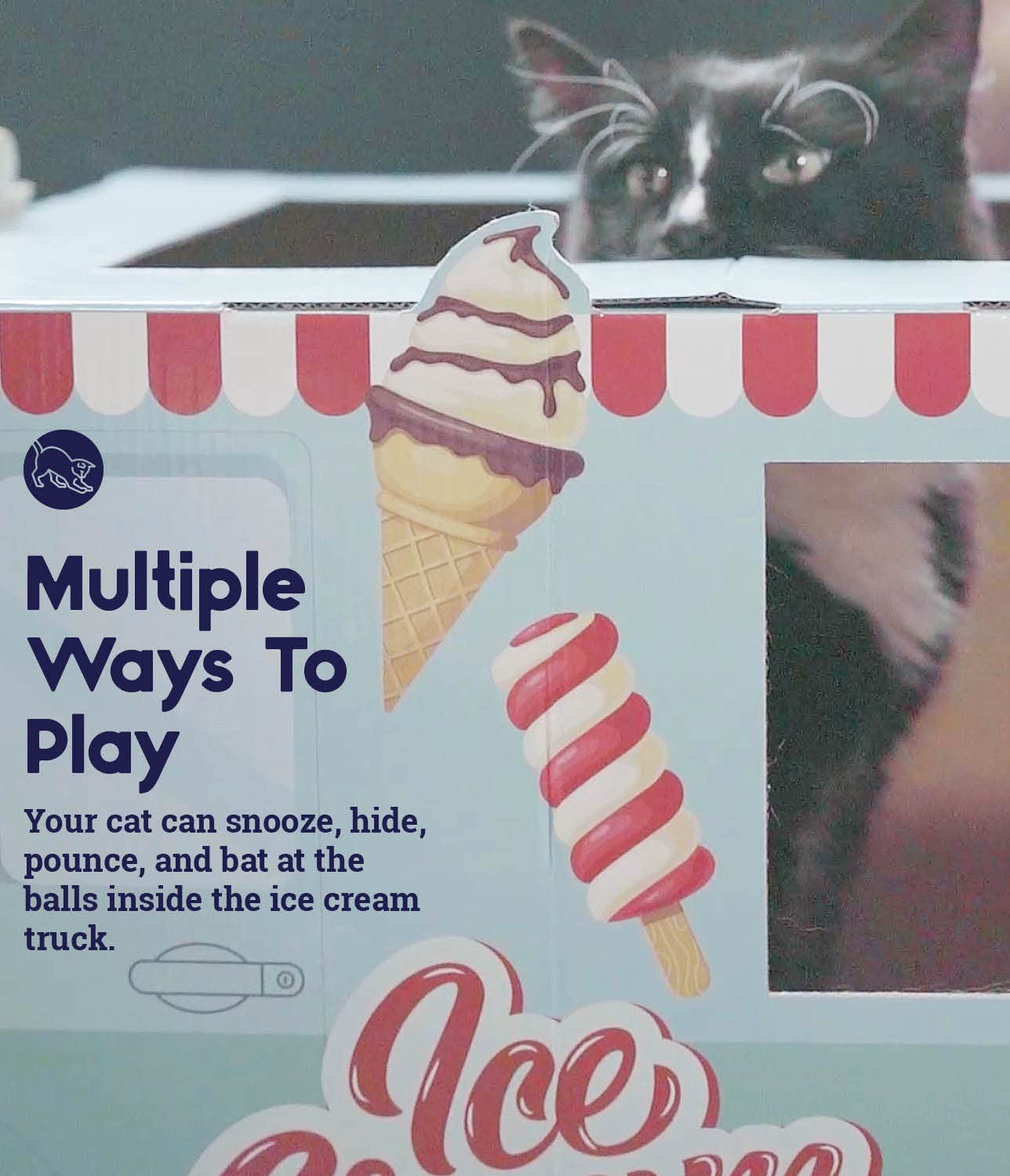 Q: How many balls are included with the ice cream truck ball pit?A: The ice cream truck ball pit comes with 10 colorful balls, providing your cat with plenty of fun for batting, swatting, and chasing.