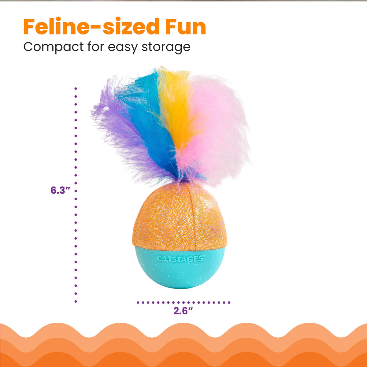 The Catstages Whack N' Wobble Ball interactive cat toy is the ultimate entertainment for frisky felines. This wobbly cat ball toy boasts a weighted bottom, ensuring it teasingly sways back and forth in response to your cat's bats and swats. The erratic wobble movement keeps cats guessing, while attached feathers and shimmering fabric are irresistible visual and tactile teases, captivating curious cats while they play. The excitement doesn't stop there – the glittery rubber base is coated in catnip oil to transform this cat ball into an enticing catnip toy, ensuring endless amusement for deserving feline herbalists. To top it off, a bell hidden within the ball jingles and rings to further pique interest and encourage extended play. Elevate your cat's playtime with the Whack N' Wobble Ball – an engaging, multi-sensory delight that promises hours of joy and entertainment. Spot Clean or Wash with warm water & mild soap. Rinse carefully & air dry. WARNING: For cats only. Contains small parts. Keep out of reach of children. When choosing a toy, make sure to choose the appropriate size for your cat. No toy is indestructible. ALWAYS supervise your cat when using a toy of any kind. Inspect toys regularly for damage and remove if broken, or if parts become separated, as serious injury may result. Some color transfer may occur if item has feathers and becomes wet. Use caution around light-colored upholstery or carpeting.