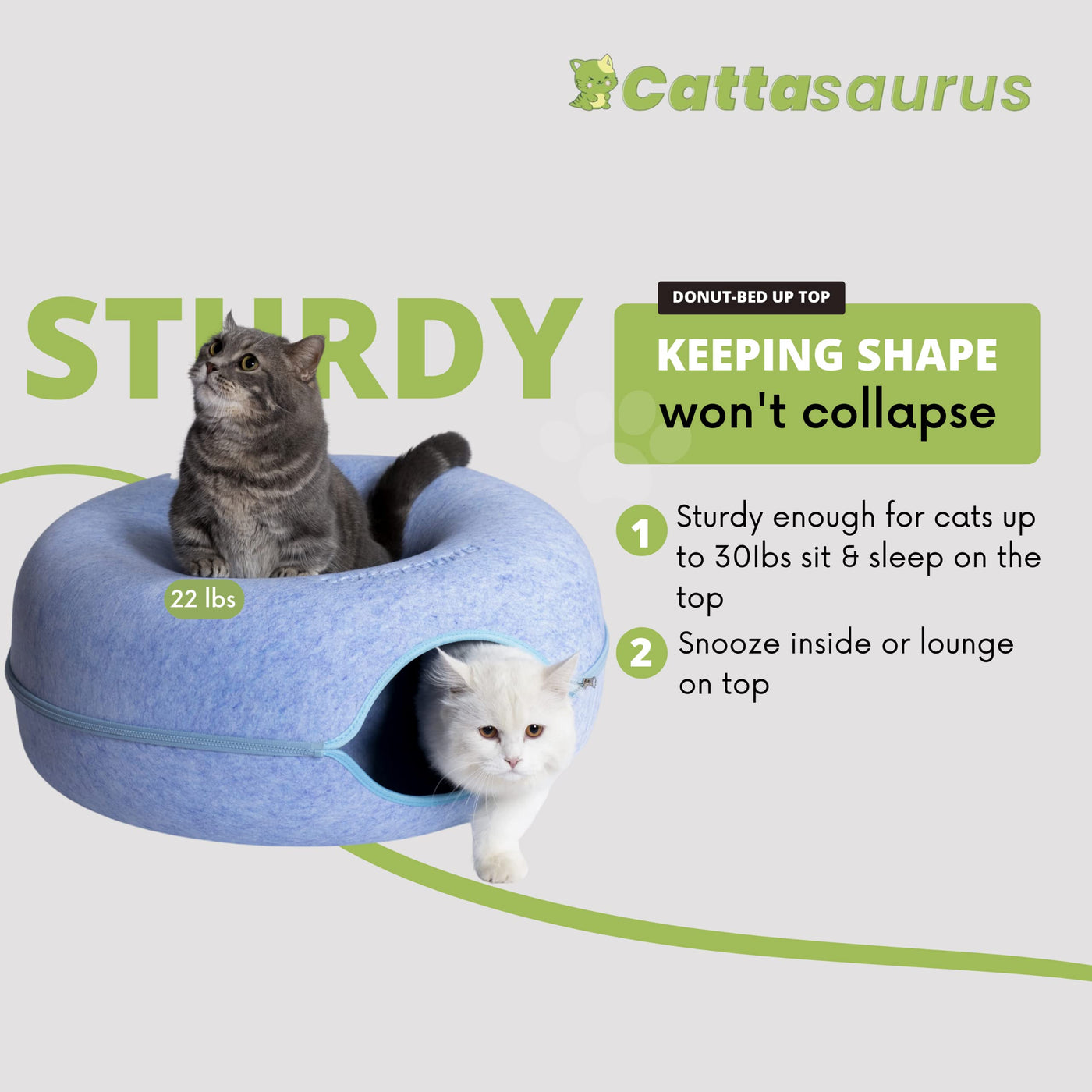 Cattasaurus Peekaboo Cat Cave For Multiple & Large Cats Up To 30-45 Lbs, Scratch Detachable & Washable Tunnel Bed, Comfy Donut Cat Cave (Blue, Large)
