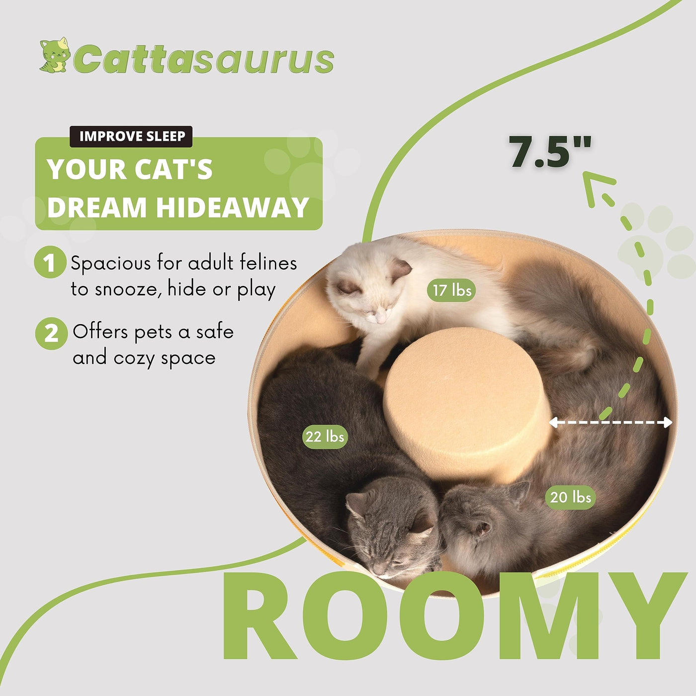 Q: What are the dimensions of the CATTASAURUS Peekaboo Cat Cave?A: The dimensions of the Peekaboo Cat Cave are 24.0 inches in length and 24.0 inches in width, offering ample space for your cats to play, hide, and sleep comfortably.