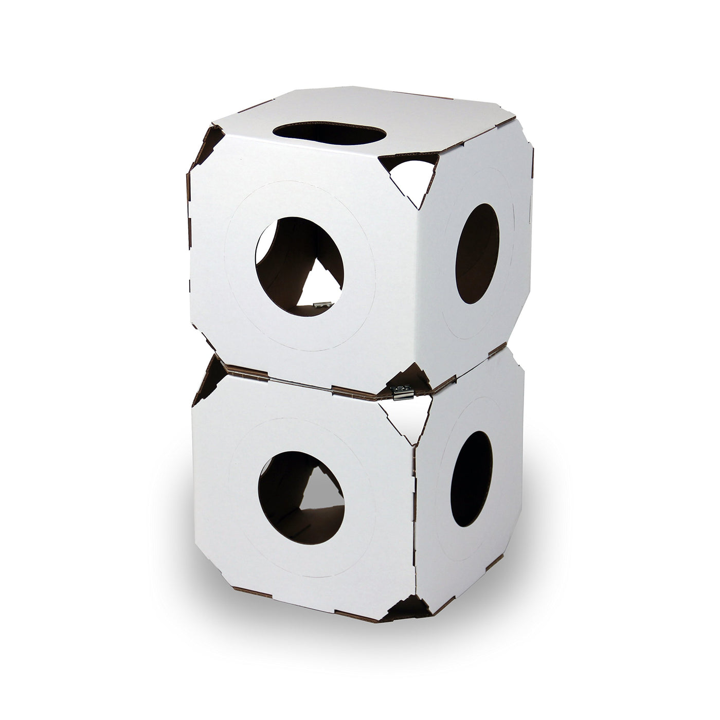Q: What materials are used to make the Catty Stacks cat house cubes?A: The Catty Stacks cat house cubes are made from high-quality, industrial-strength Corrugated Ultra board, which is both recycled and recyclable, ensuring durability and safety for your cats.