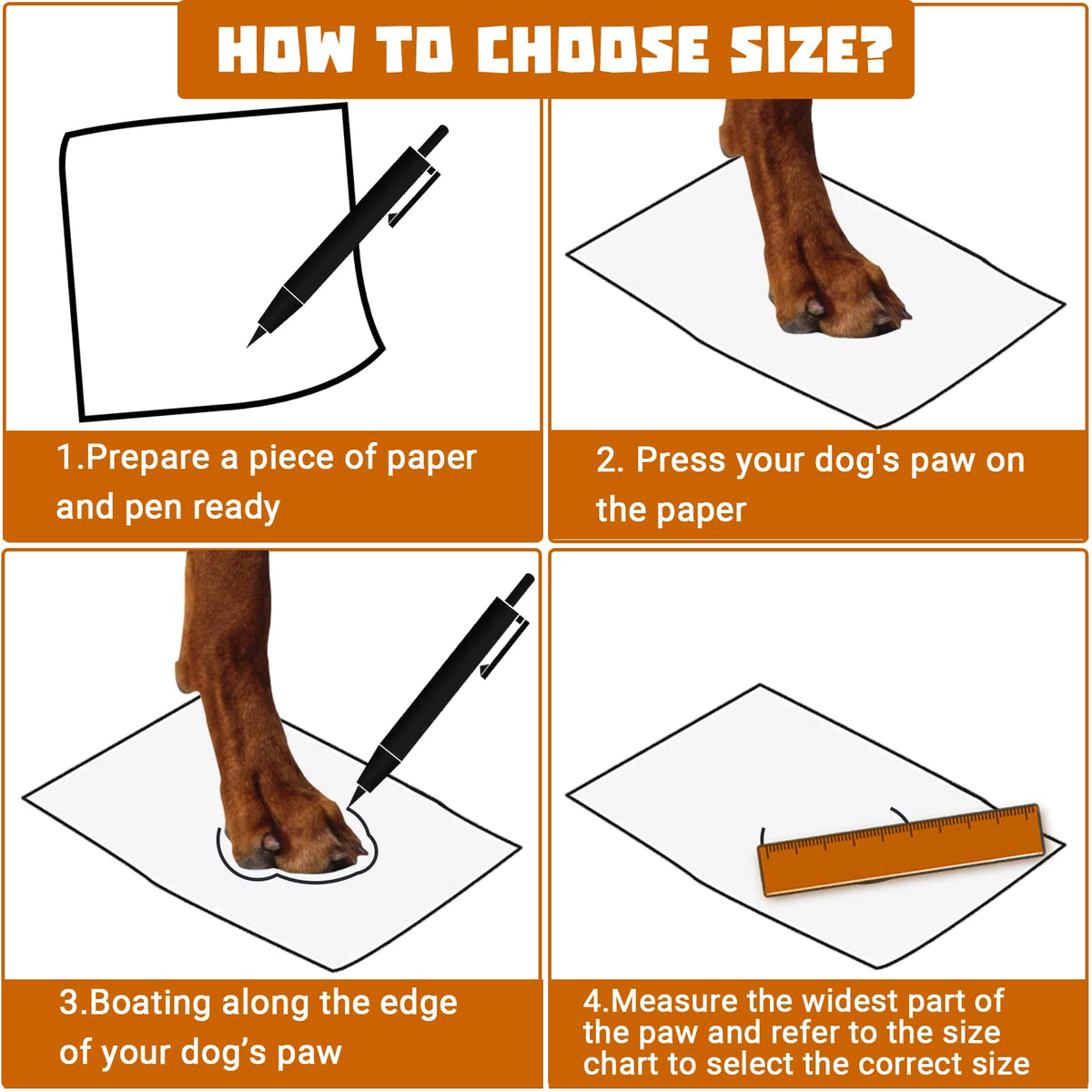 1) Place the paw on a piece of paper and press down on the top, mimicking how the paw spreads when the dog is walking; 2) Mark the left and right sides on the paper and measure the distance between the marks; 3) Measure the paw Maximum length and width; 4) Choose the shoes with size a little larger than paw size (around 1cm larger).