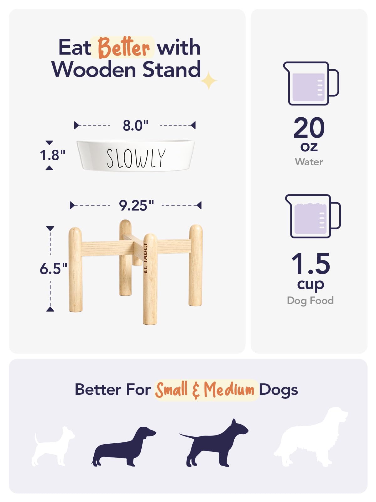 Ceramic Slow Feeder Dog Bowls Elevated For Small And Medium Breed, With Wooden Stand, 1.5 Cups To Slow Down Eating, Anti-Gulping