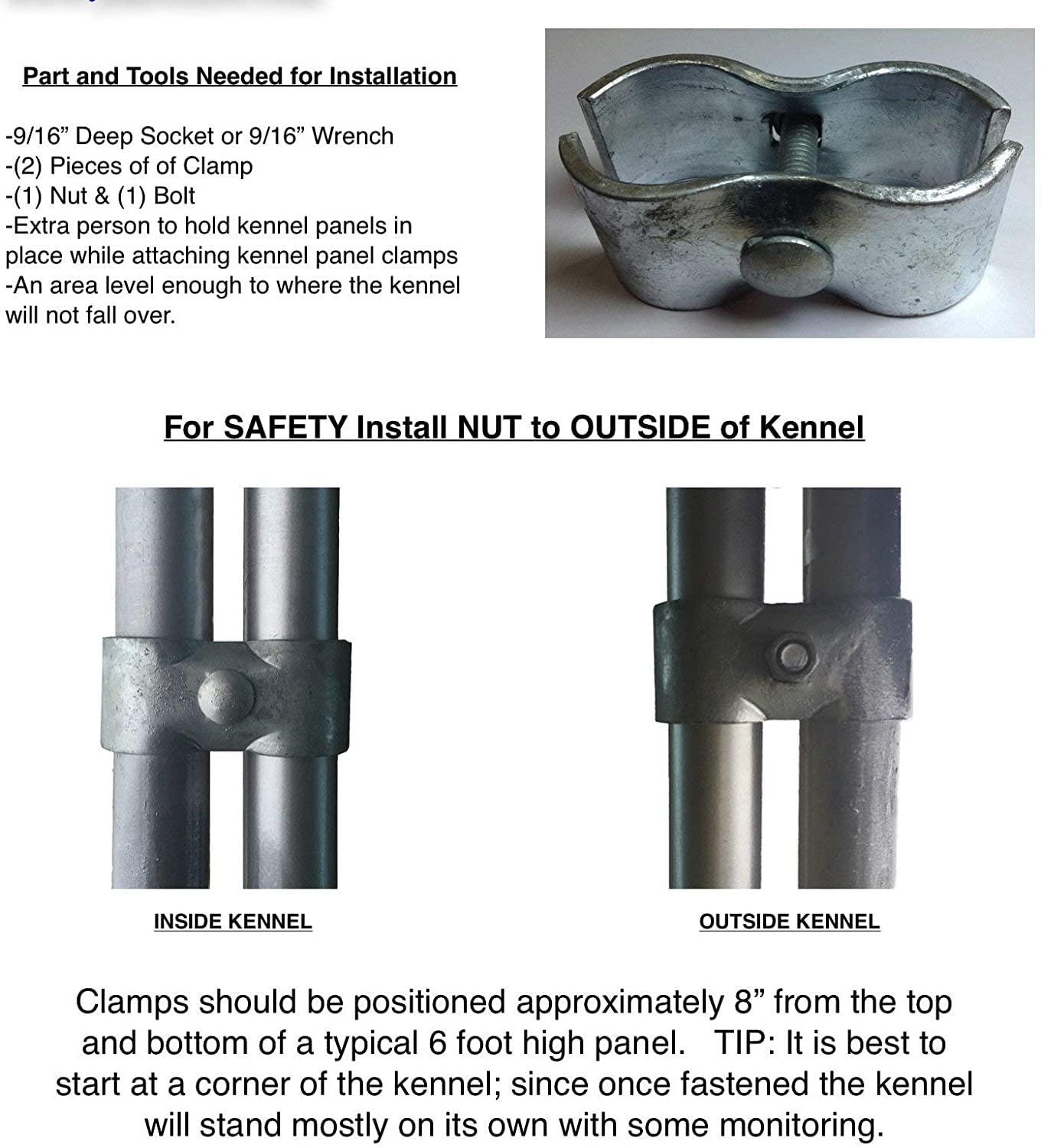 Chain Link Fence Panel Clamps ~ Kennel Clamps: Set Of 8 Clamps (Bolts Included) If You Are Setting Up Temporary Fencing With Chain Link Panels Or Other Pipe Panels That Have 1-3/8'' Pipe Frames, Then These Are The Clamps You Need. These Panel Clamps Are Also Used As ''Kennel Clamps'' For Building A Chain Link Dog Kennel (Or Chain Link Dog Run). Sturdy And Easy To Use. Chain Link Fence Panel Clamps ~ Kennel Clamps: (Set Of 8) For 1-3/8'' Chain Link Fence Pipe Panel Frames. For Dog Kennels / Dog Runs, Or Temporary Chain Link Fence. Saddle Clamps. Chain Link Fence Parts For Connecting Panels ~ Farm Fencing Systems. W/Bolts Pack Size: 8 Chain Link Fence Panel Clamps Designed To Fit 1 3/8'' Rails And 1 3/8'' Posts Made From Durable Pressed Steel That Has Been Galvanized To Prevent Rusting Includes 5/16 X 1 1/4'' Carriage Bolts And Nuts Panel Clamps Are Commonly Used To Clamp Two Sections Of Fencing Together