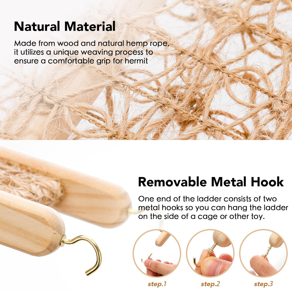 Crafted Using Natural, Untreated Wood That Is 100% Pet-Safe. Perfect For Play And Entertainment. Perfect For Hermit Crabs. The Hammock Measures 7.1 X 7.1 Inches (18 X 18 Cm) The Hermit Crab Ladder Bridge Measures: 10 X 3.62 Inches (25.4 X 9.2 Cm)