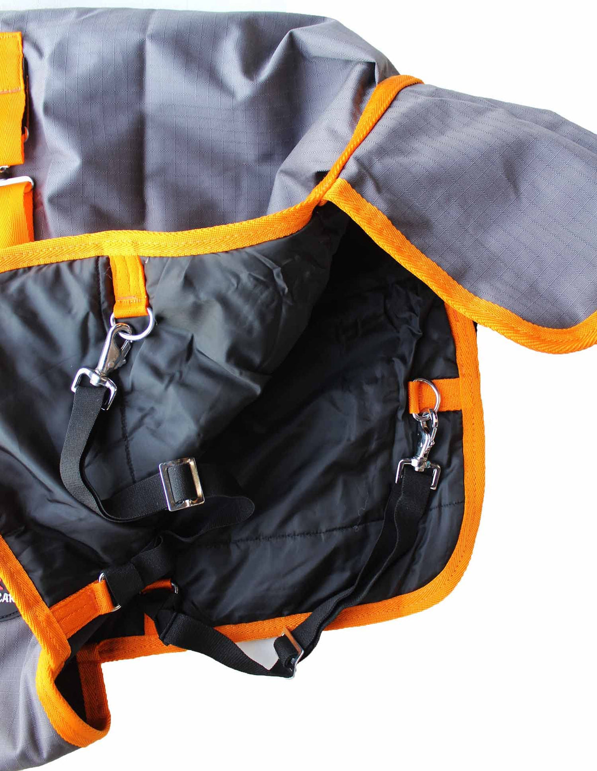 Made of 1000 Denier heavy duty rip-stop outer for durability and 250g of Polly-fill providing warmth and wind protection. Blanket features an adjustable double buckle front closure pull & loop adjustable neck and bellyband for custom snug fit . The reinforced double-sewn stress points offer additional reinforcement to help prevent tears while the fleece wither helps provide protection from rubbing. Shoulder gussets allow for freedom of movement and help to prevent shoulder rubbing.