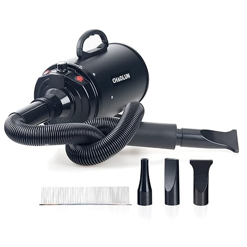 CHAOLUN Grooming Dryer The brand pet dryer was equipped with a powerful and stable motor. Whether it's a giant dog or mini cat, it can quickly dry. The CHAOLUN Grooming Dryer makes drying your furry friend(s) of all sizes an easy task. This lightweight, portable, durable dryer features two switches that allow you to comfortably adjust the speed and heat levels. The efficient dryer saves your grooming time by up to 60 percent. The slim design of the 91-inch stretchable hose and handle placement gives you the capability to maneuver it effortlessly while protecting your hands from the selected heat option. By a quick snap on and off clasp, you can customize the dryer with the included three various size nozzles, which will give you a different grooming experience. Due to removable filters, this dryer is easy for maintaining cleanliness and keeping pet hair out. With its efficient and powerful function, the dryer is suitable for any pet.Power: 2400w Voltage:110V-120V~