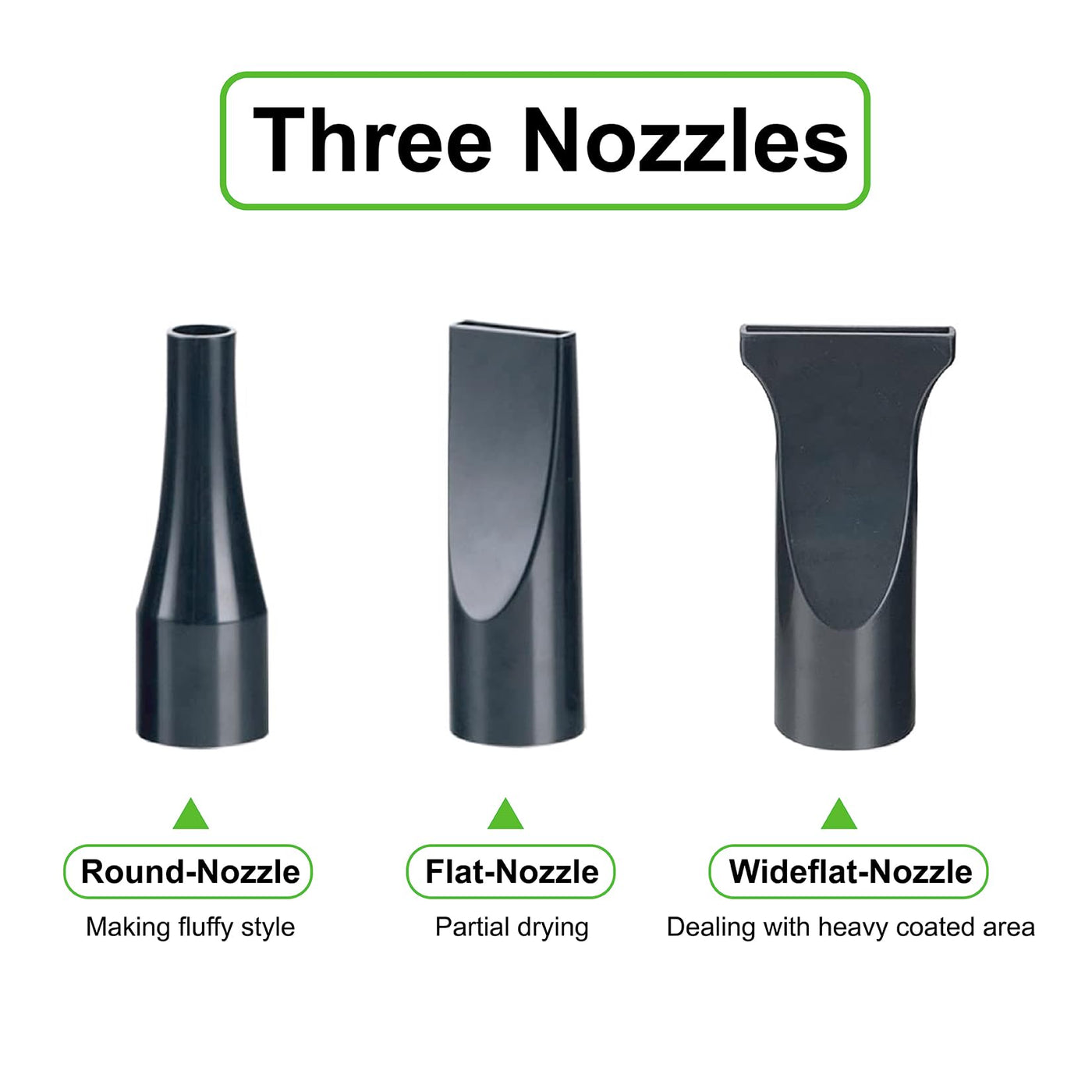 Q: What nozzles are included with the CHAOLUN Dog Dryer?A: The CHAOLUN Dog Dryer comes with three different types of nozzles, allowing you to customize your grooming experience based on your pet's fur type and drying needs.