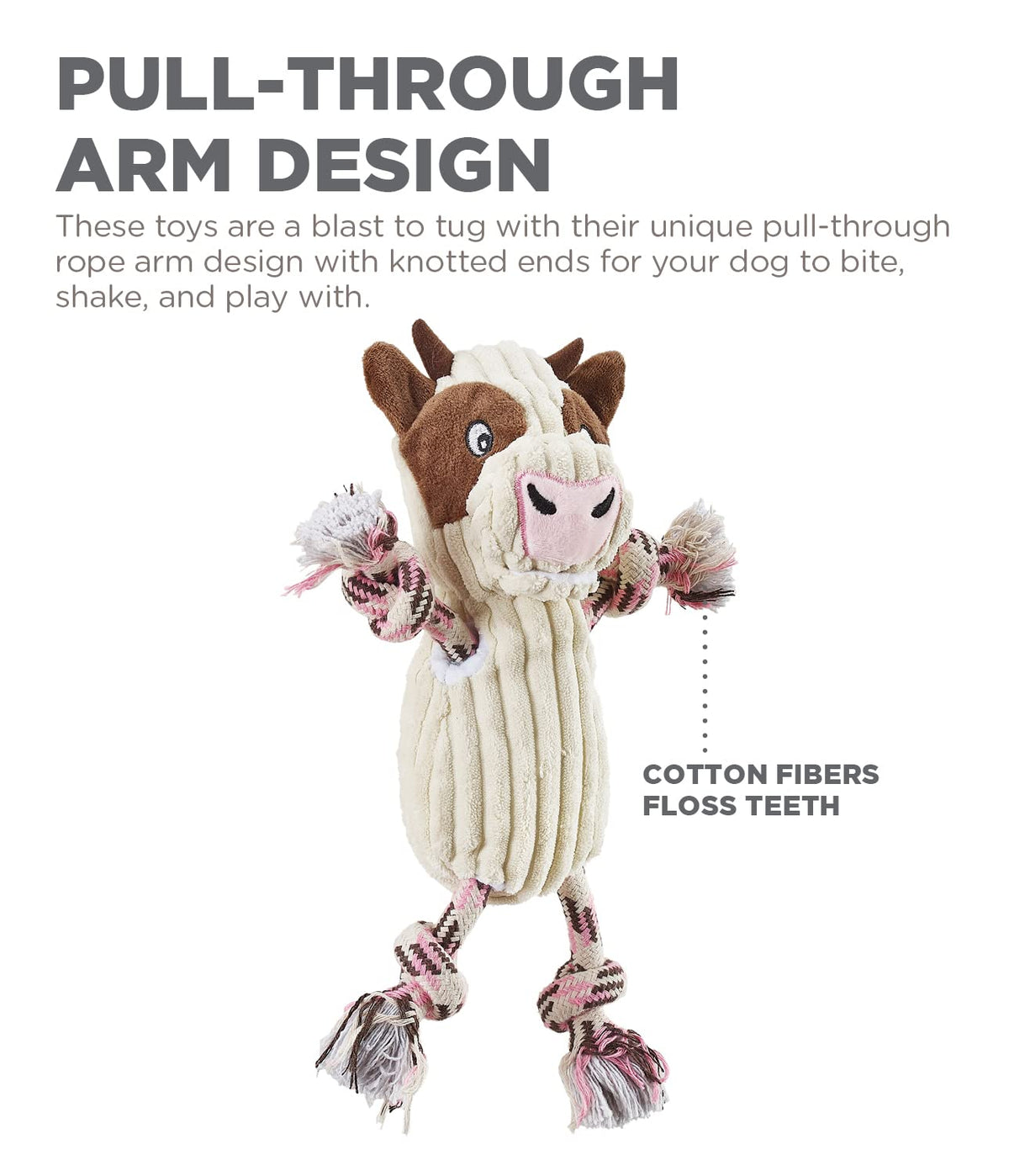Inspired by classical barnyard animals, the Ranch Roperz interactive plush dog toys are sure to get your pup excited to play! Made from soft corduroy on the outside for easy chomping and cuddling and climbing rope limbs for a satisfying bite. Charming Pets proprietary K9 Tuff Guard technology adds durability and longevity with denier canvas lining, nylon-fused backing, and double stitched seams. The pull-through arm design makes these dog toys perfect for games of fetch, toss, and tug-of-war. Available in multiple adorable characters. Note, Ranch Roperz plush dog toys are not meant to be used as chew toys.