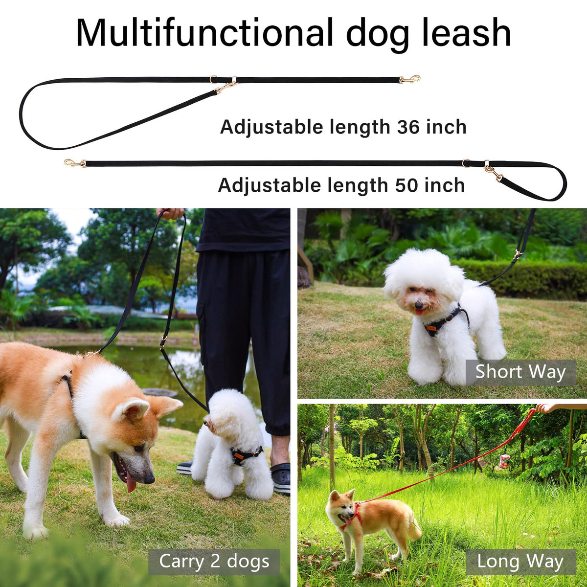 Q: Can I use the leash for two dogs at the same time?A: Absolutely! The multifunctional dog leash included with the harness can be adjusted to two different lengths, making it suitable for walking two dogs simultaneously.
