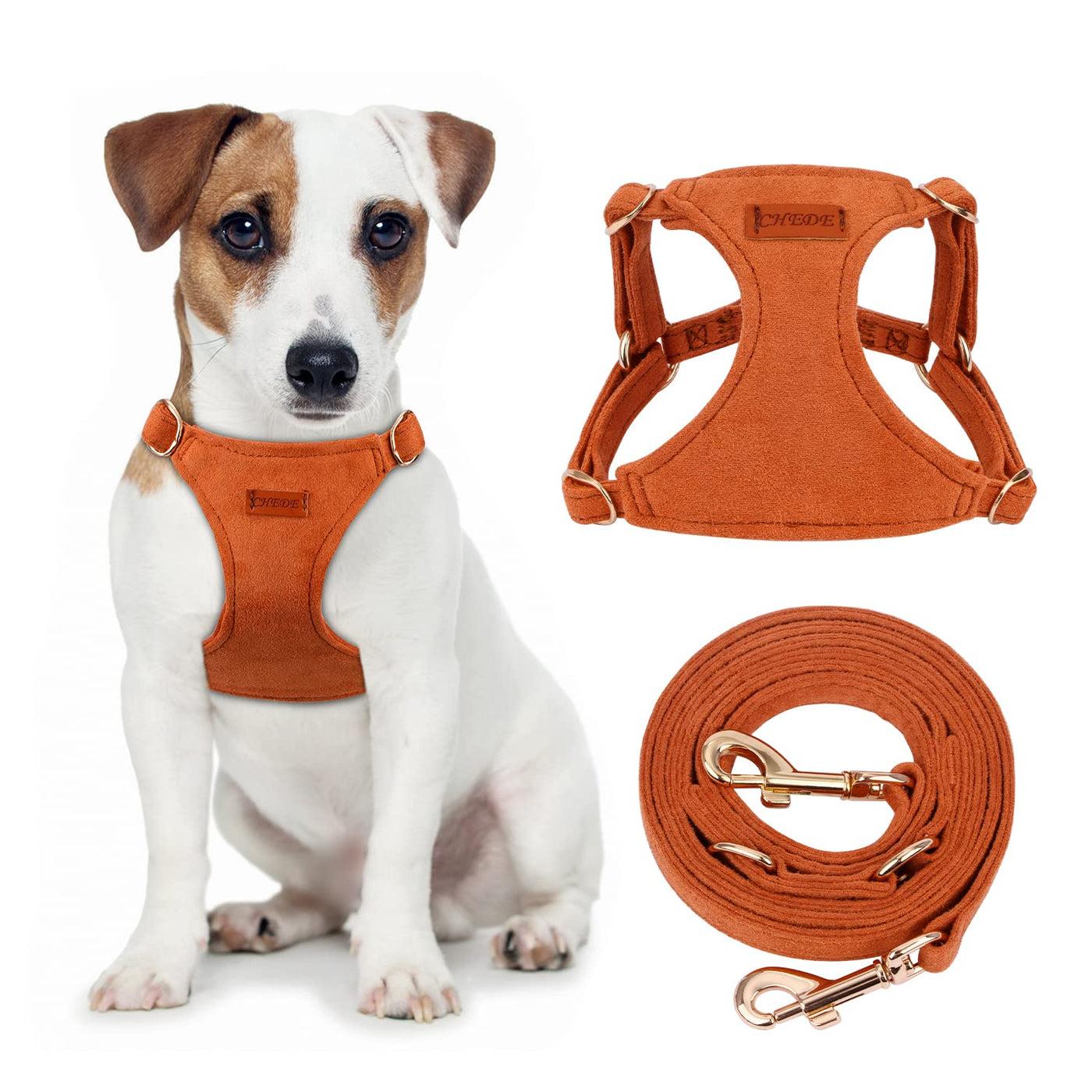 Q: What materials are used in the CHEDE harness and leash set?A: The harness is made from a blend of aluminum, faux suede, and polyester, which ensures it is soft, breathable, and durable. The metal components are sturdy and rust-resistant, providing a longer service life.