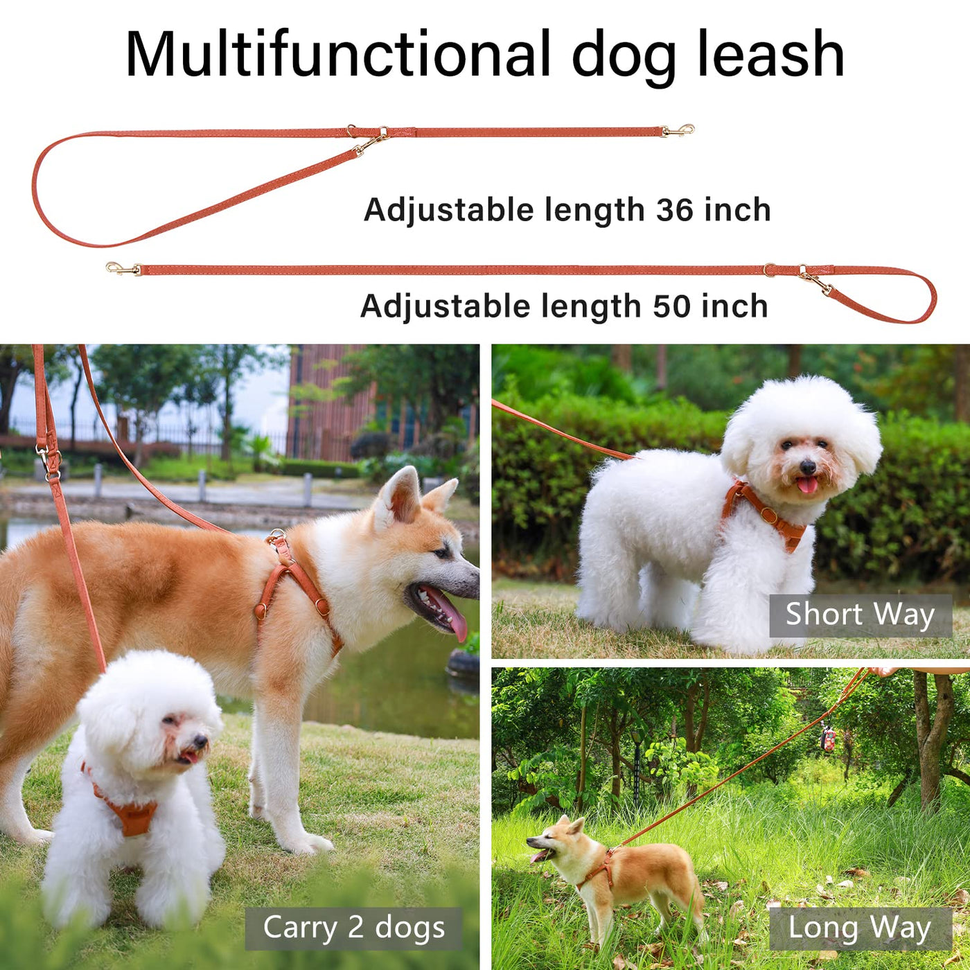 Q: Can I use the leash for two dogs at the same time?A: Yes, the multifunctional dog leash is designed to accommodate two dogs at once, making it perfect for pet owners with multiple dogs. Additionally, it can be adjusted to two different lengths for added convenience.