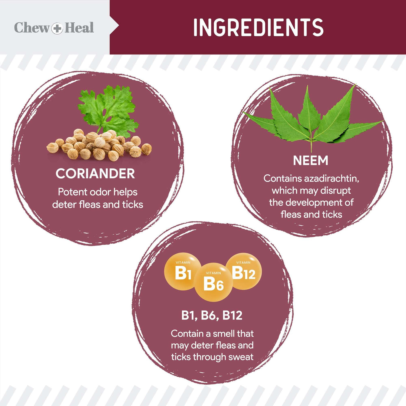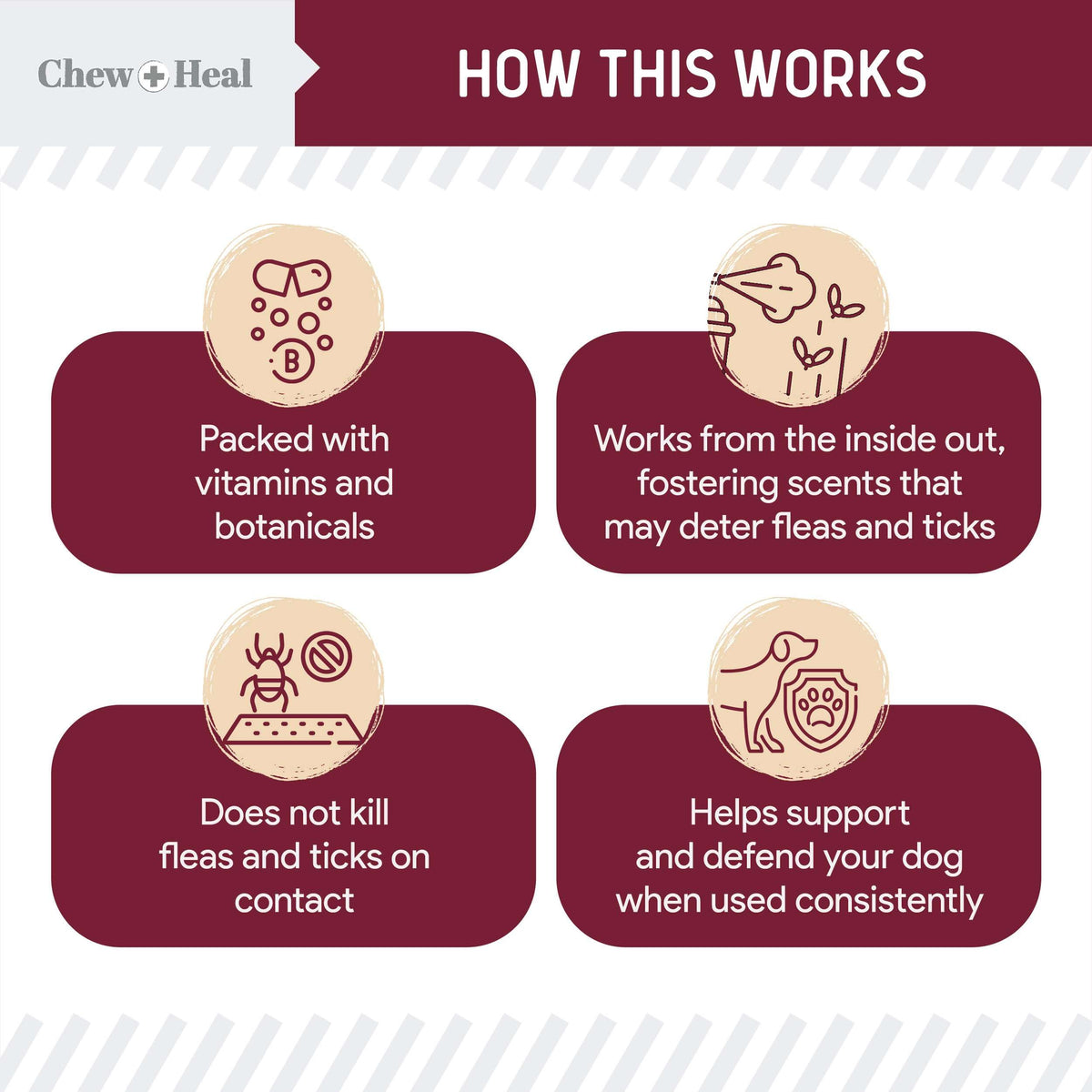 Introducing Chew + Heals Flea and Tick Soft Chews for Dogs - the natural solution for protecting your furry friend from pesky pests, without the worry of harsh chemicals or allergens. Crafted with care and backed by nature, these soft chews are designed to keep your dog comfortable and healthy year-round. Say goodbye to the irritation and discomfort caused by fleas and ticks, and embrace the power of a holistic approach. Each soft chew is thoughtfully formulated with a blend of flaxseed meal, coriander, neem, and essential B vitamins (B12, B1, and B6) to create a potent defense against unwanted insects. Flaxseed meal provides a source of omega-3 fatty acids, supporting your dogs skin health and promoting a shiny, lustrous coat. Coriander and neem work together synergistically, offering natural repelling properties that keep fleas and ticks at bay. These ingredients have been trusted for generations to maintain optimal wellness. The inclusion of essential B vitamins further enhances your dogs overall vitality. Vitamin B12 aids in cell repair and supports the immune system, while vitamins B1 and B6 contribute to healthy nerve function and metabolic processes. With Chew + Heals Flea and Tick Soft Chews, youre not only safeguarding against pests but also nurturing your dogs overall well-being. What sets these soft chews apart is not just whats inside, but also whats left out. You can have peace of mind knowing that these chews are free from harsh chemicals, gluten, GMOs, and corn - making them suitable for dogs with various sensitivities. Your dog deserves only the best, and Chew + Heals commitment to quality ensures that these chews meet the highest standards of excellence. Make outdoor adventures enjoyable again for your furry companion, and embrace a natural, holistic solution to flea and tick protection. Choose Chew + Heals Flea and Tick Soft Chews and experience the transformation in your dogs comfort and vitality.