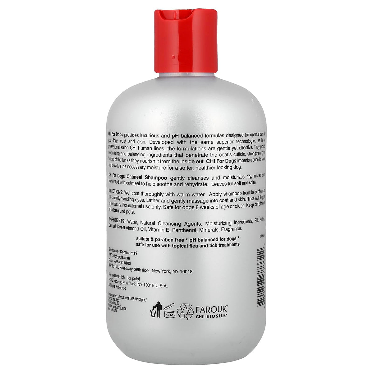 Product DescriptionCHI For Dogs provides luxurious and pH balanced formulas designed for optimal care for your dog's coat and skin. Developed with the same superior technologies as in our professional salon CHI human lines, the formulations are gentle yet effective. They provide moisturizing and balancing ingredients that penetrate the coat's cuticle, strengthening the follicles of the fur as they nourish it from the inside out. CHI For Dogs imparts a superior shine and provides the necessary moisture for a softer, healthier looking dog. CHI For Dogs Oatmeal Shampoo gently cleanses and moisturizes dry, irritated skin. Formulated with oatmeal to help soothe and rehydrate. Leaves fur soft and shiny.Directions: Wet coat thoroughly with warm water. Apply shampoo from back of ears to tail, carefully avoiding eyes. Lather and gently massage into coat and skin. Rinse well. Repeat as necessary. For external use only. Safe for dogs 8 weeks of age and older. Keep out of reach of children and pets. Ingredients: Water, Natural Cleansing Agents, Moisturizing Ingredients, Silk Protein, Oatmeal, Sweet Almond Oil, Vitamin E, Panthenol, Minerals, Fragrance.YOUR SATISFACTION IS OUR PRIORITY* - If you have any questions or feedback, please reach out to us at infofetch4petsbrand_descriptionChi for Dogs
