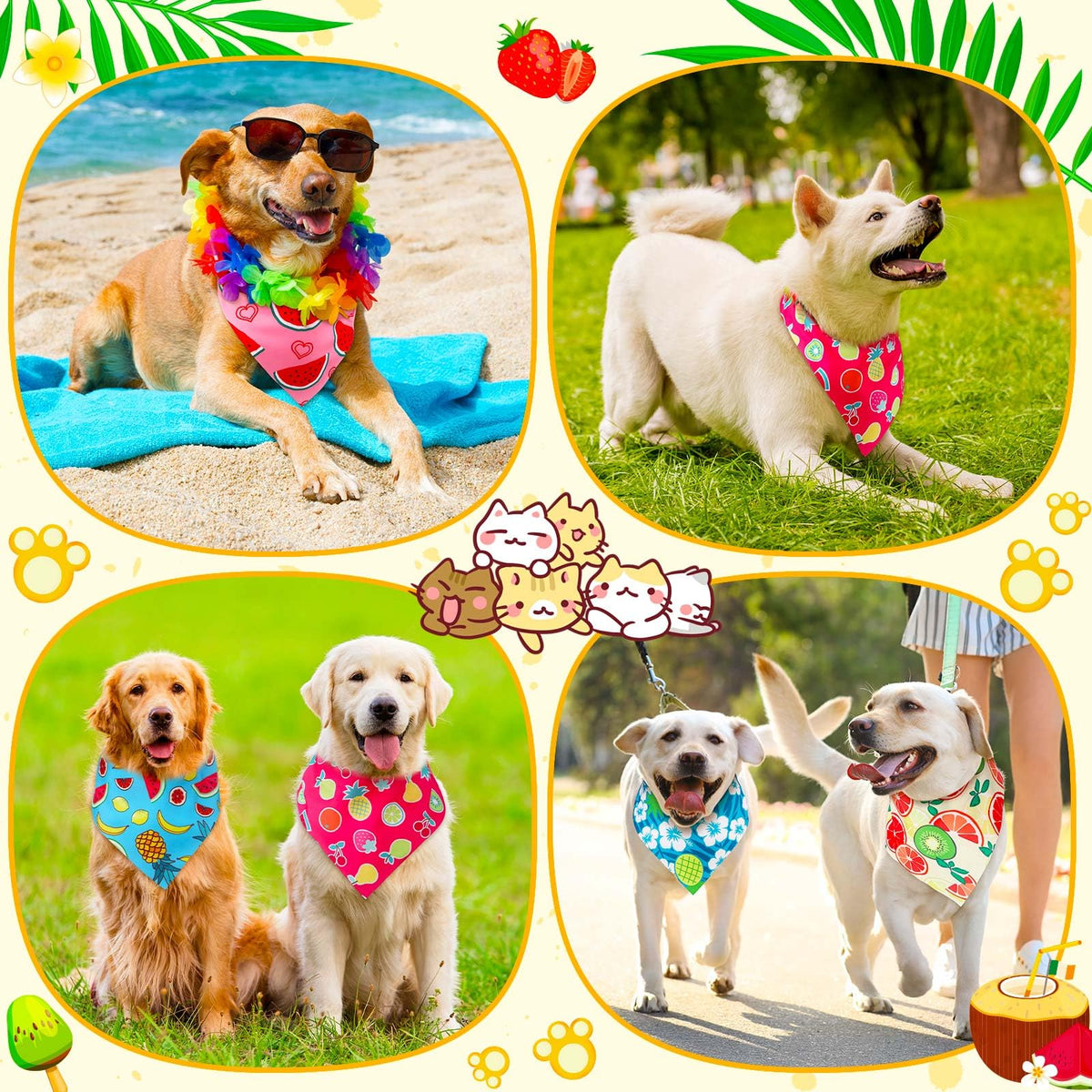 Features: The vibrant bandanas not only reflect the holidays charm but also serve as thoughtful gifts, making the festivity memorable for your pet and those around. The enough quantity to meet to choose to dress up your pet in costume parties or share with your family or mates who have lovely pets. Specifications: Material: polyester Color: multicolor Size: about 25.6 x 17.7 x 17.7 inches/ 65 x 45 x 45 cm Package includes: 48 x Summer theme dog bandanas Notes: Manual measurement, please allow slight errors on size. The color may exist a slight difference due to different screen displays. Small items are included, please keep them away from pets in case of choking risk. Before purchase, confirm whether the product size is suitable for your pet, and observe the pets reaction when using. Please remove the product in time if there is any discomfort.